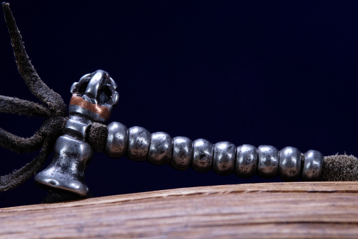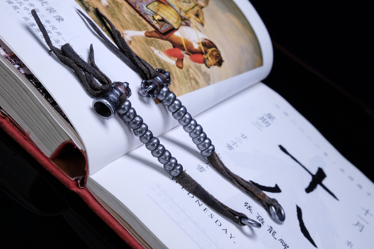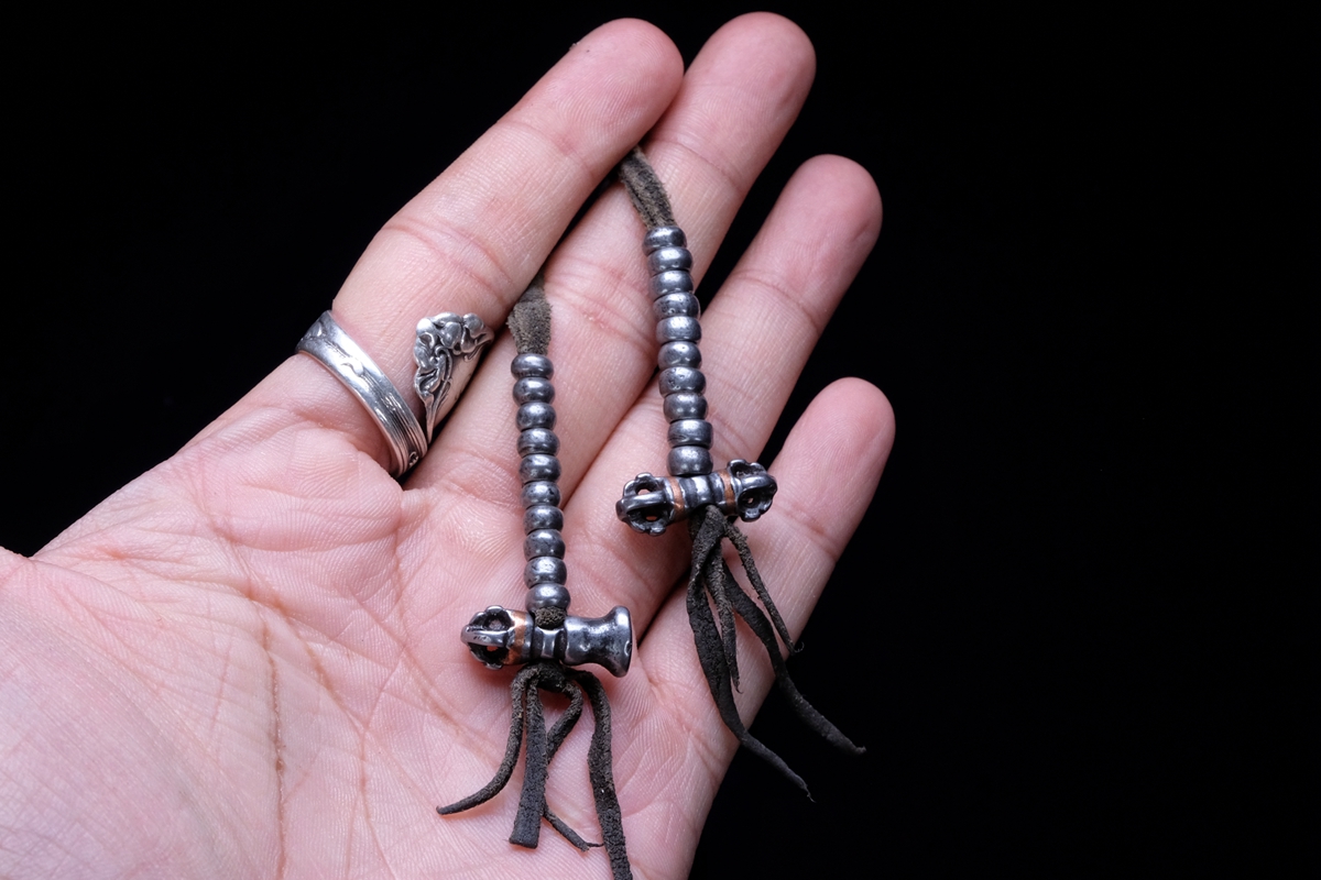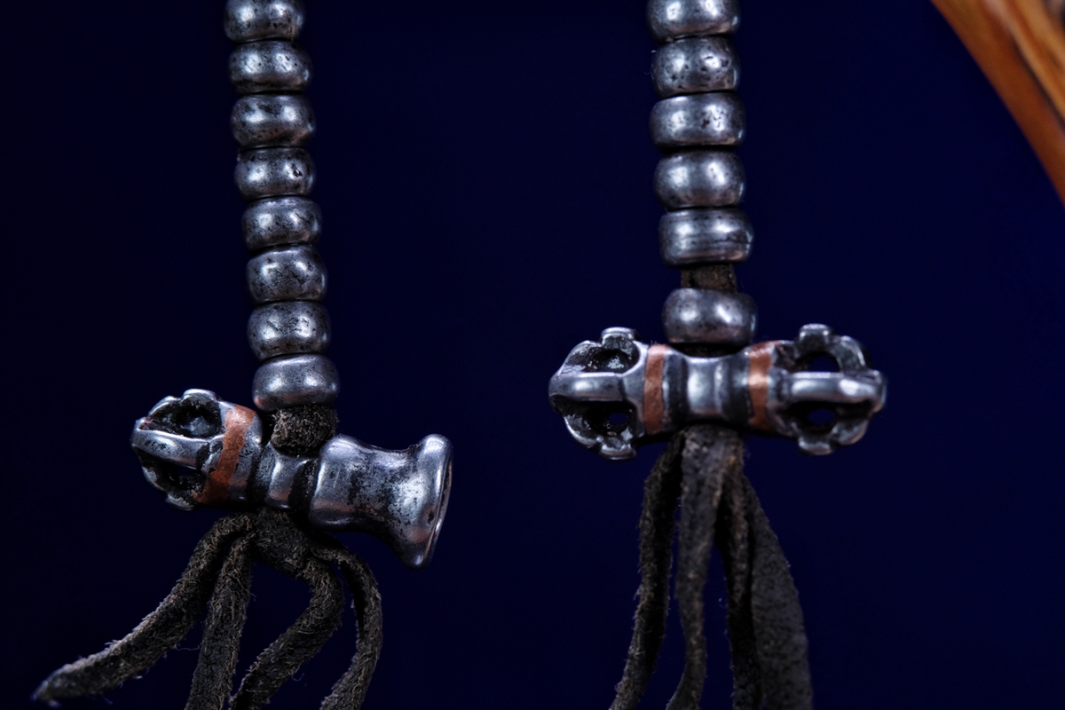 介绍:经典藏传寒铁材质,手工铁雕计数器,雕刻细节非常扎实,完美复刻铃杵造型。记头部分有嵌铜工艺,点缀的非常出彩。挂环也是同材质原配的,绝对百搭。尺寸用来搭配10左右念珠都不错。