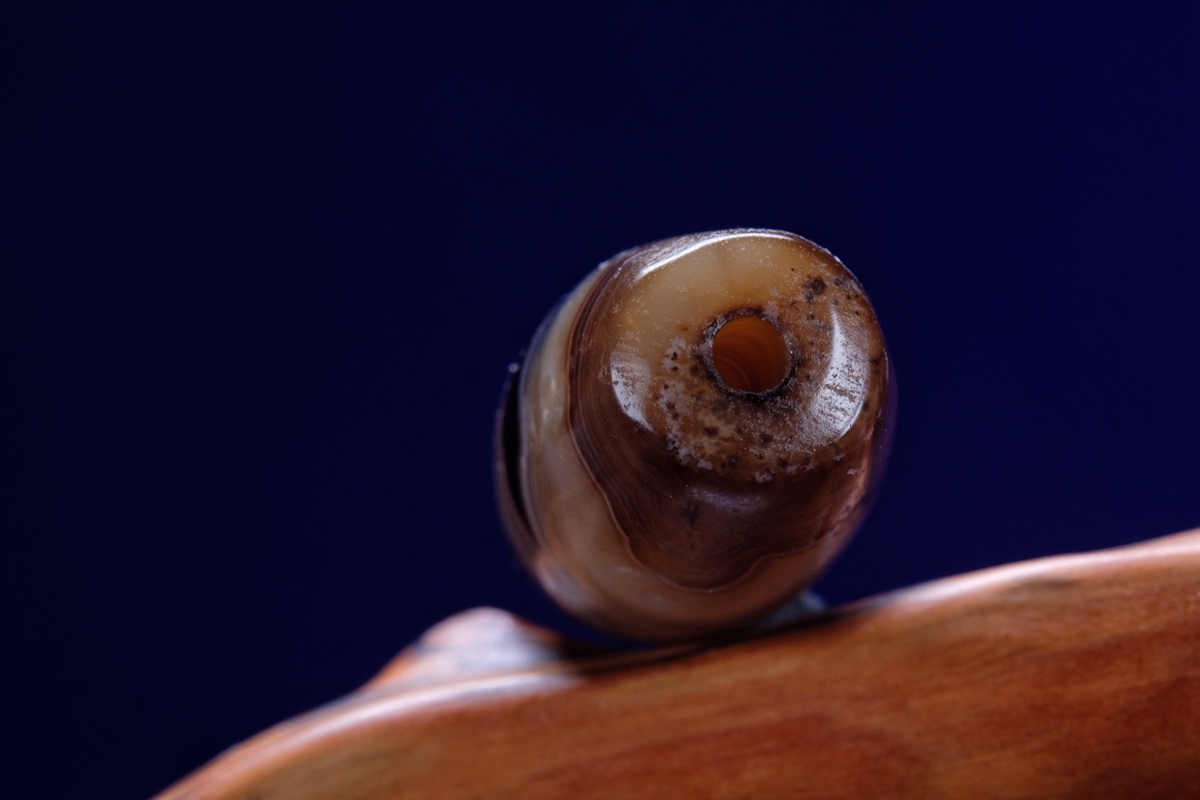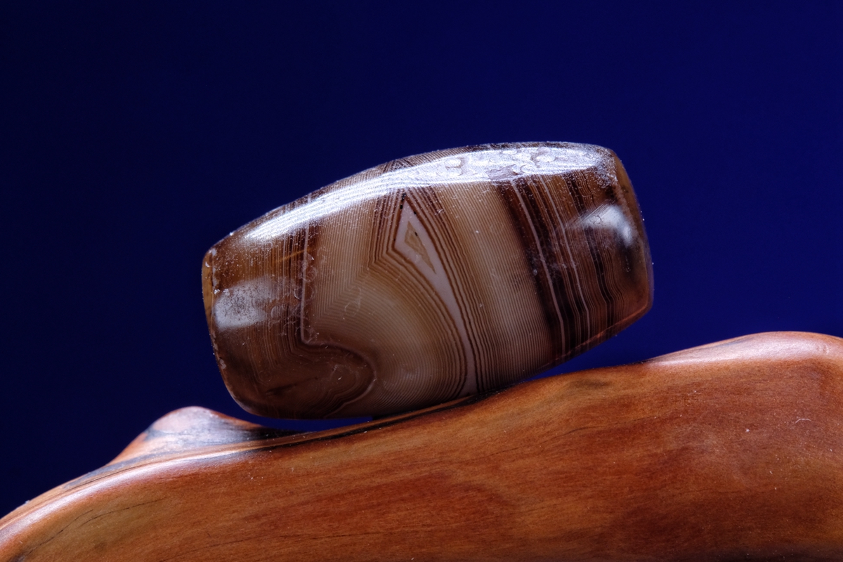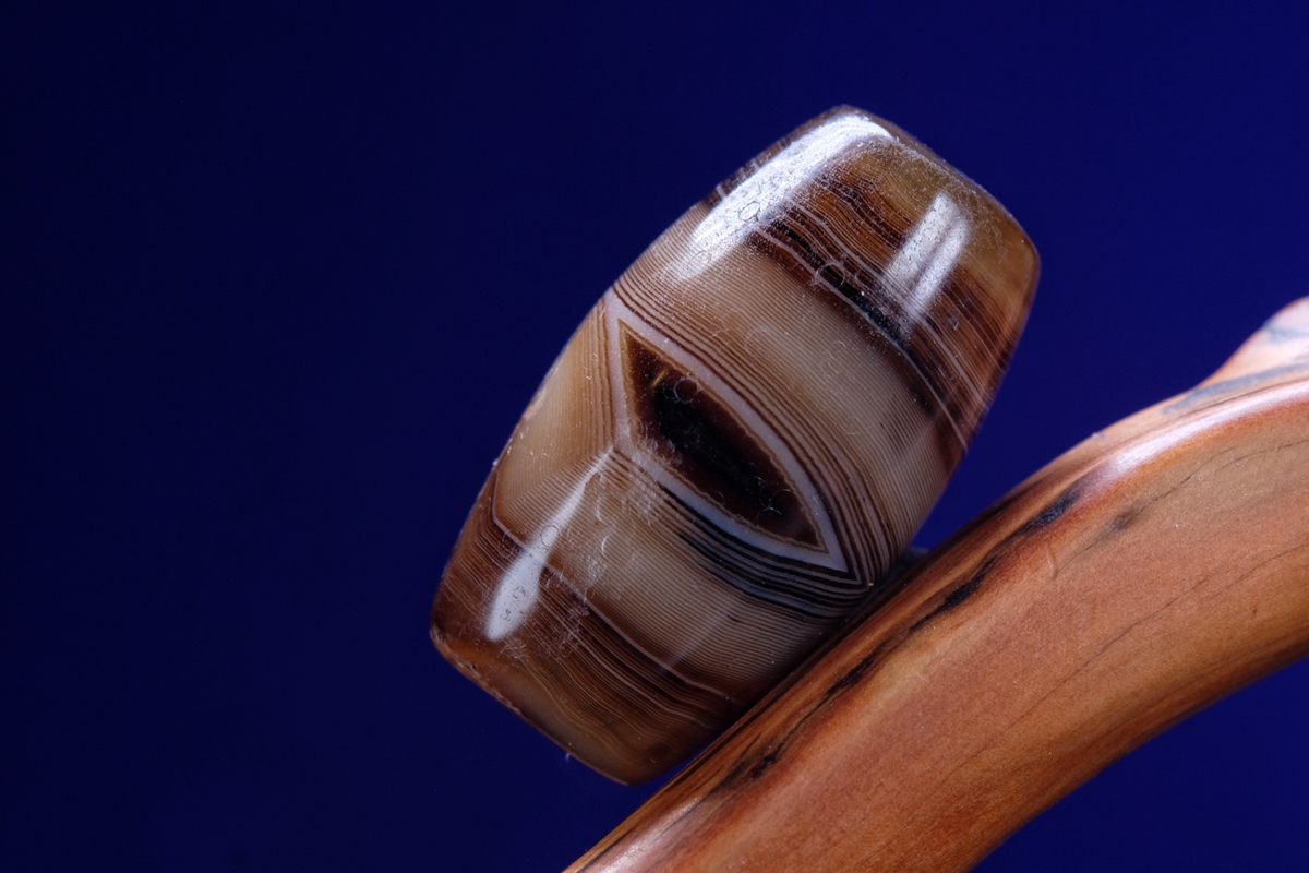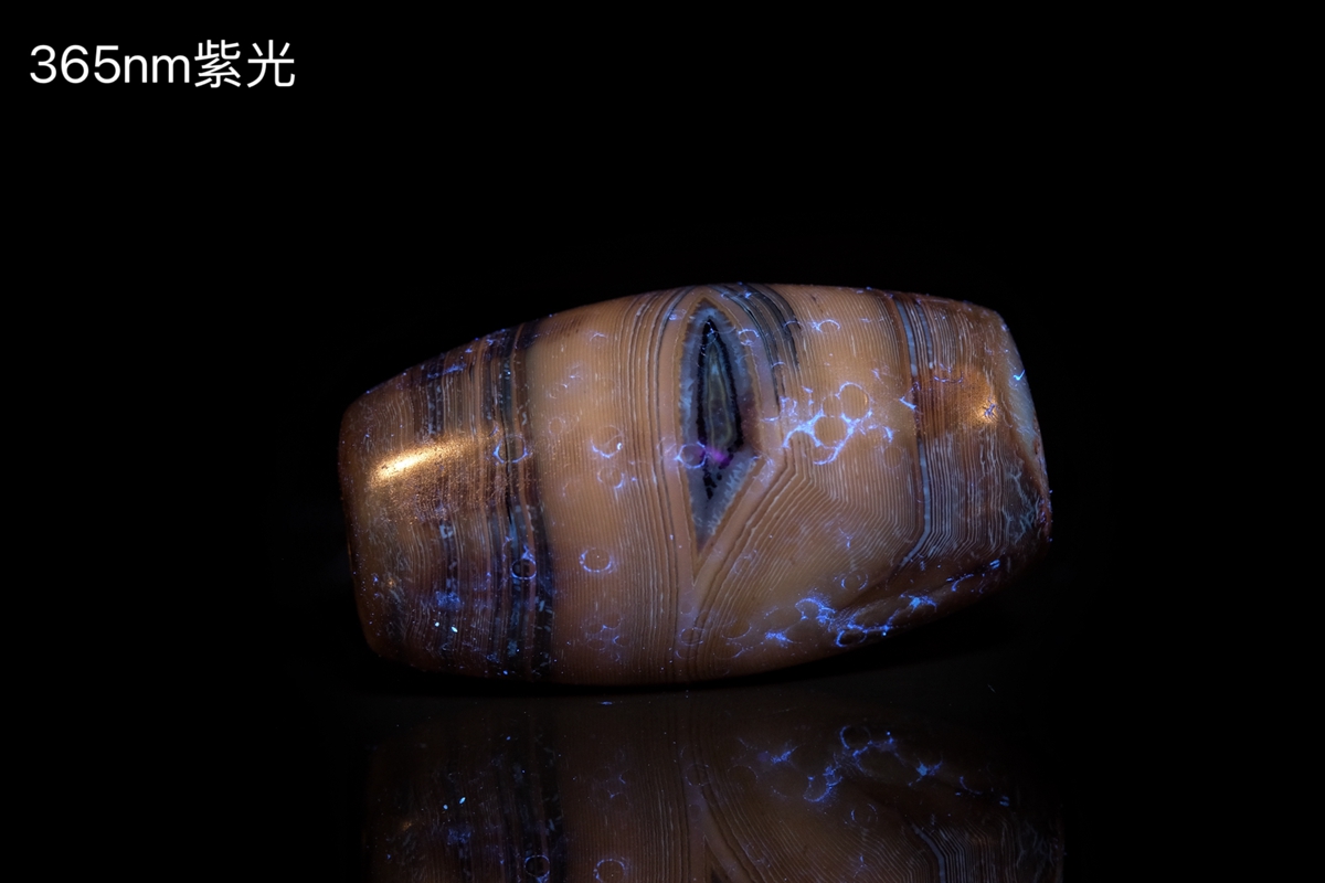 介绍:这颗虽然不是很长,但这个直径够大了吧,绝对同类珠子里不算小的了。几乎周身满风化,包浆嘎嘎厚实,传世包浆磨损。整体呈浅色系,正面一枚漆黑财神眼,背面一枚小小的白财神眼,绝对品相和颜值双双在线的一颗。这颗沁不是很多,紫光下能看到一点内沁和内风化,两端有些许朱砂。