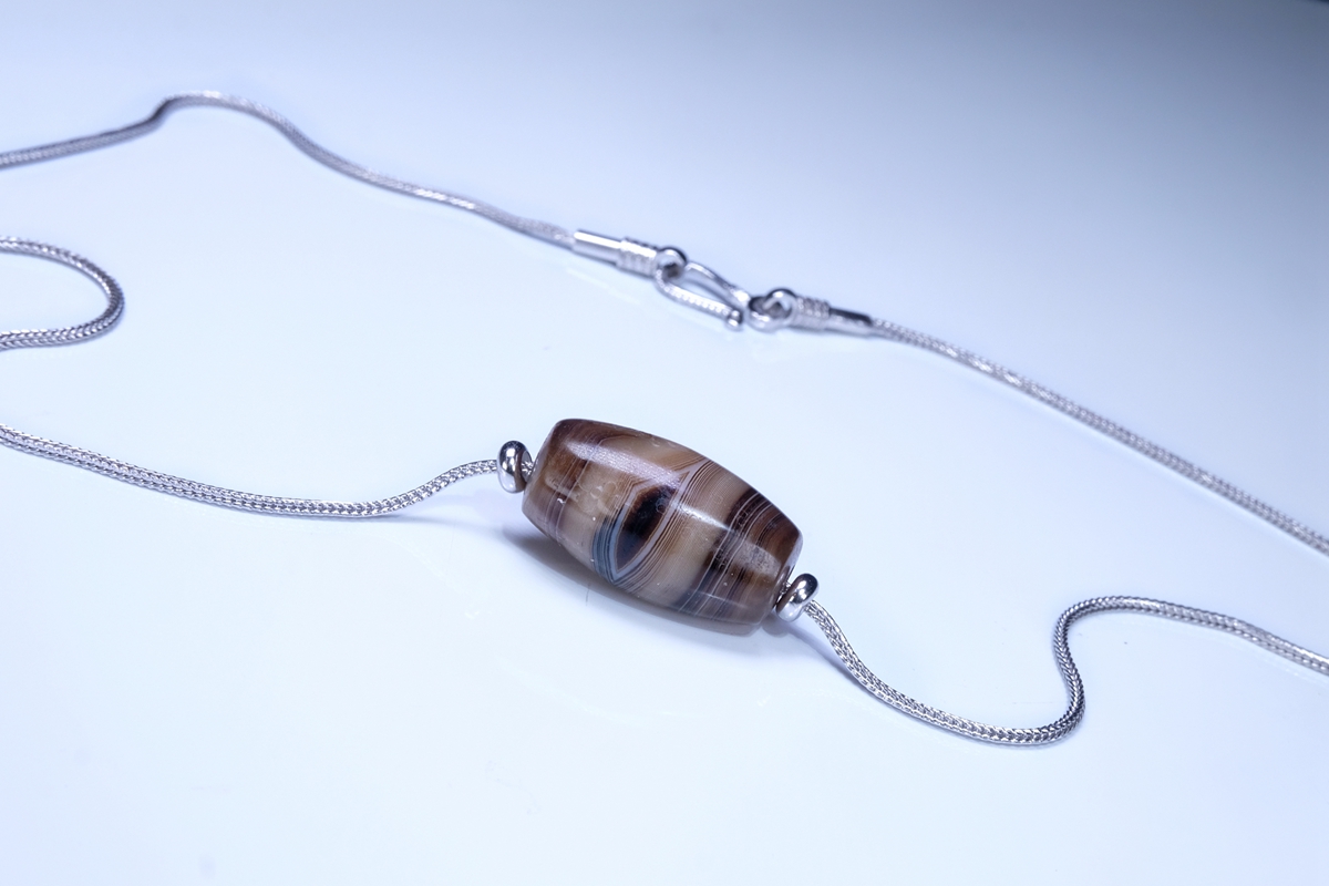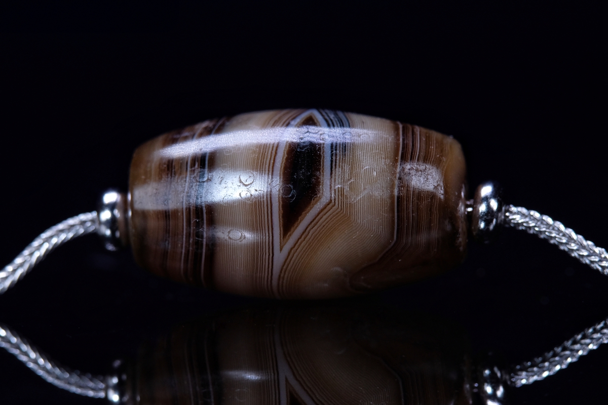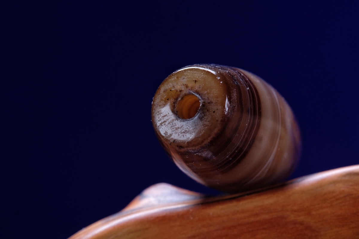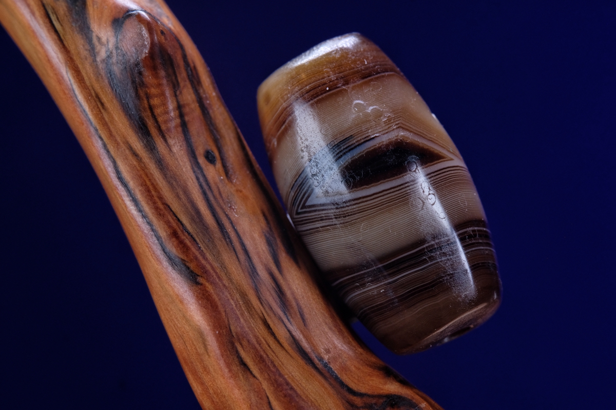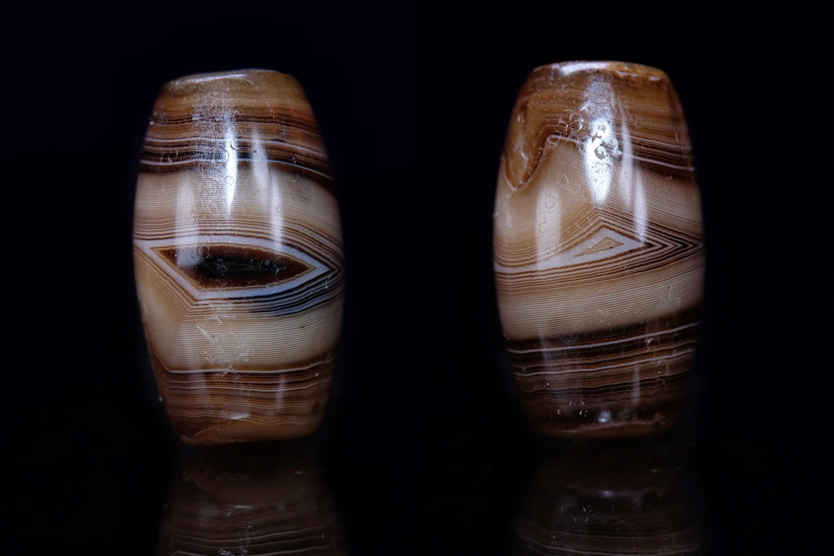 介绍:这颗虽然不是很长,但这个直径够大了吧,绝对同类珠子里不算小的了。几乎周身满风化,包浆嘎嘎厚实,传世包浆磨损。整体呈浅色系,正面一枚漆黑财神眼,背面一枚小小的白财神眼,绝对品相和颜值双双在线的一颗。这颗沁不是很多,紫光下能看到一点内沁和内风化,两端有些许朱砂。