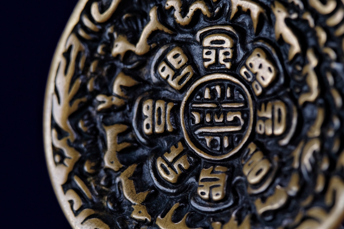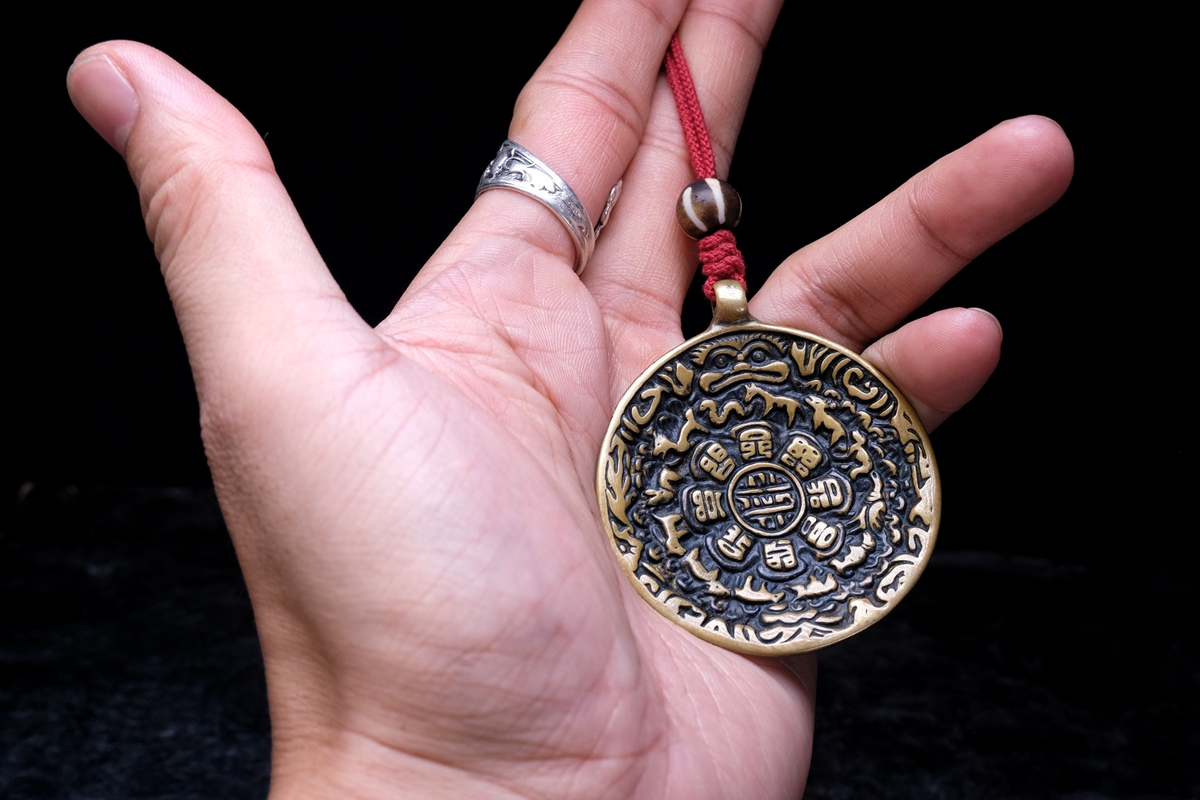 介绍:给我一个拒绝这枚九宫的理由?这模版,这做工,这用料,需要介绍么?绝对寺院法会出品,背面能看出来明显是加过金银甘露等材质的合金铜,和正常铜制氧化质感完全不一样。实物磨损、包浆都可以说是教科书级别。版面干干净净,标准的头版头模才能拥有的立体感和图腾深度。绝对够你毕业的一枚!
