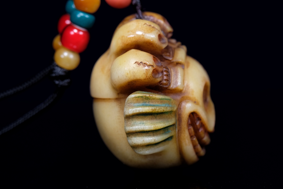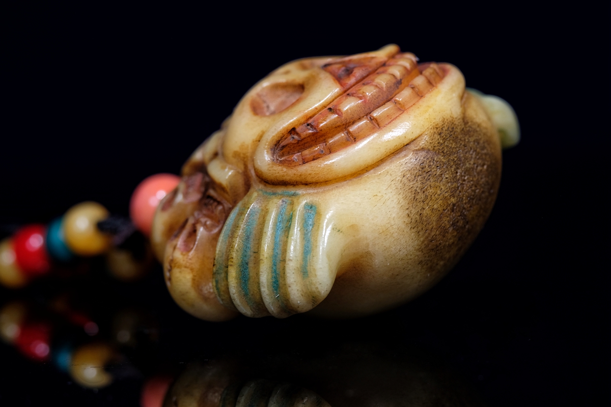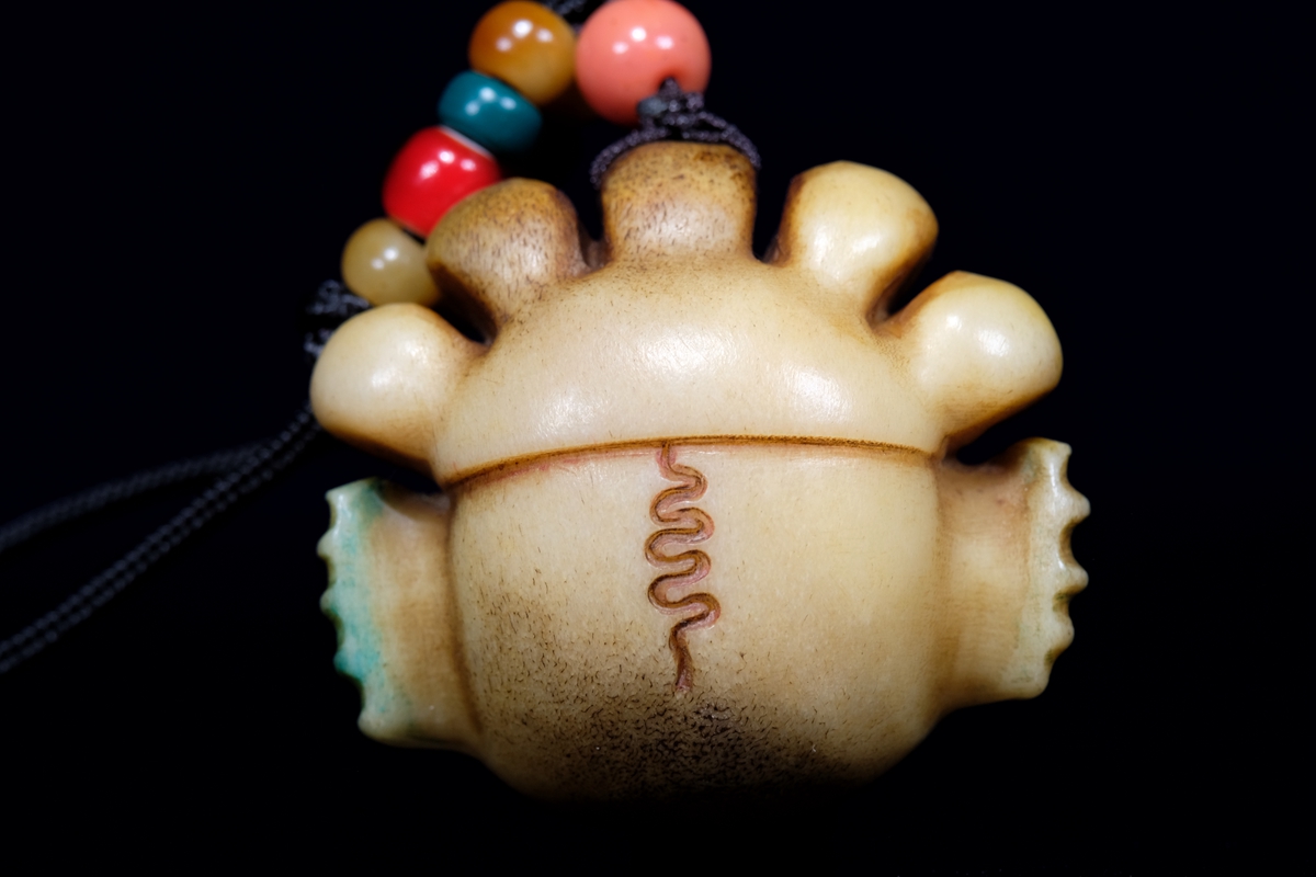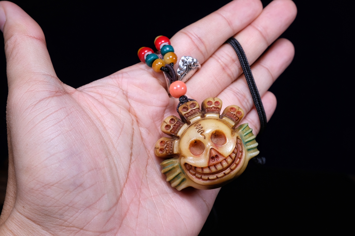 介绍:牦牛膝骨雕刻,传统工艺染色,极具藏地风格的一枚吊坠。骨质细腻完美,整料雕刻而成,饱满器型,圆润饱满。染色也是传统手工艺品,非常自然带感。尺寸适合男生佩戴,还是比较厚实的。搭配了一些小年份琉璃珠。