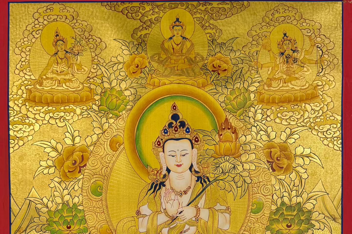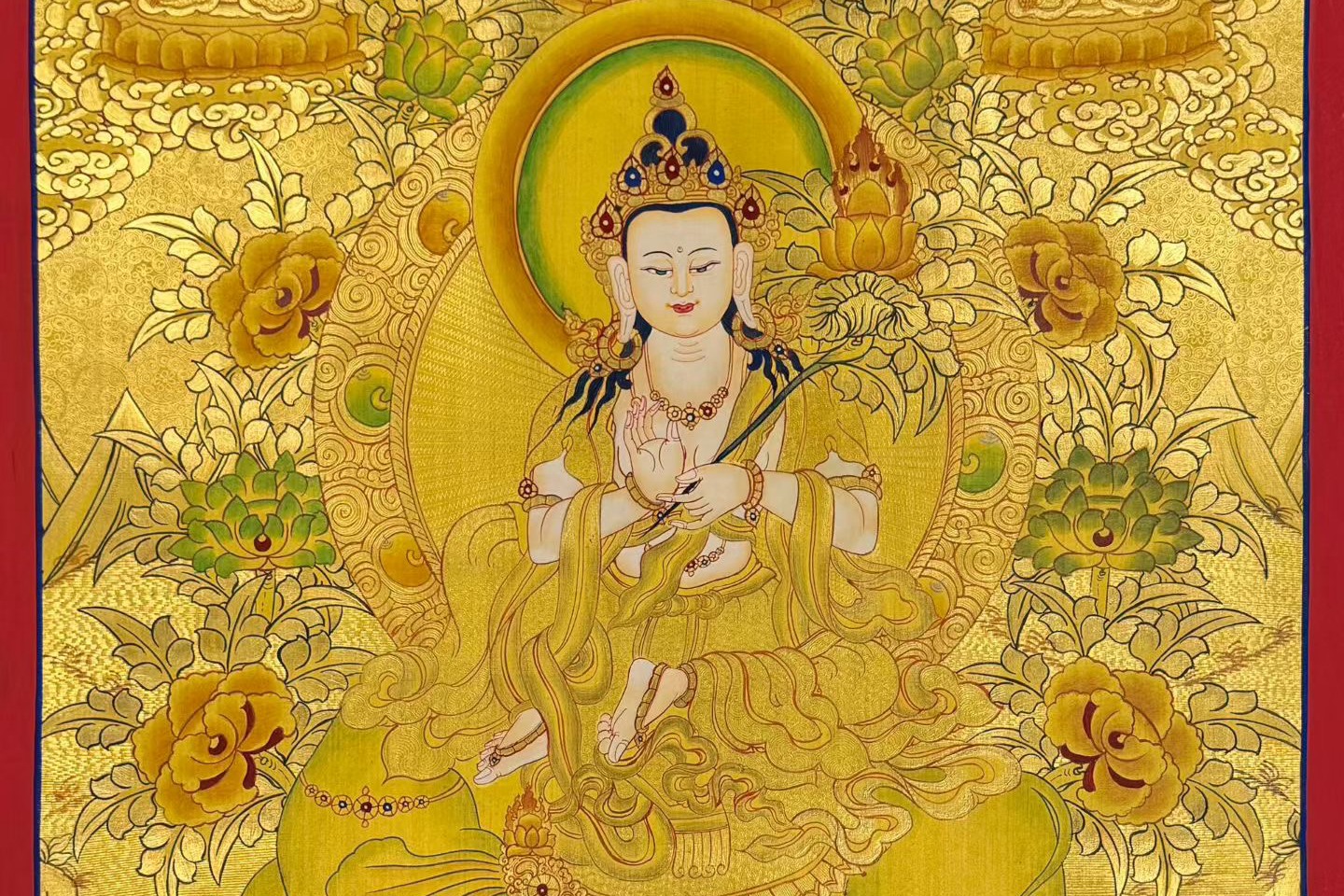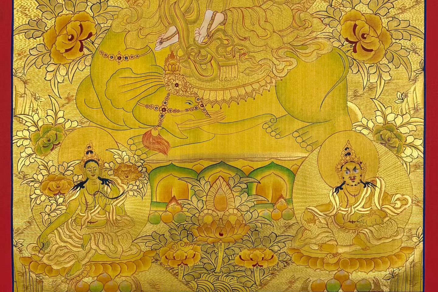 介绍:高品质金箔唐卡 【普贤菩萨】,实物金光璀璨,幅面满工丰富,实物极为震撼,金箔唐卡也叫刻金唐卡,先在布面上施以金箔,再铅笔打底稿,矿物颜料勾勒晕染,最后用玛瑙刀雕刻出花纹,绘制过程非常复杂,人物造像各不相同,但开脸都极为传神,造像生动自然,衣饰法器等飘逸,栩栩如生,画师匠心可见一斑。这幅普贤菩萨唐卡是少有的花纹雕刻和勾勒晕染都十分精彩的佳作,衣饰、法器、身体线条等勾勒得十分细致流畅,精美绝伦。