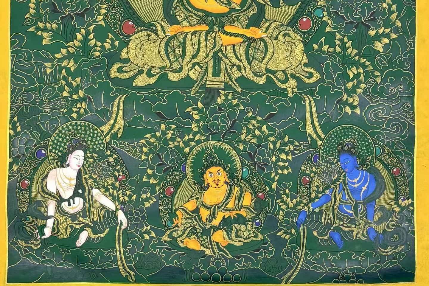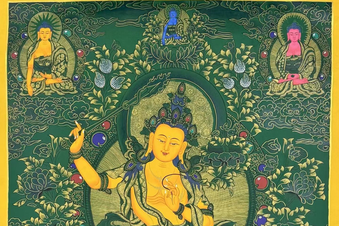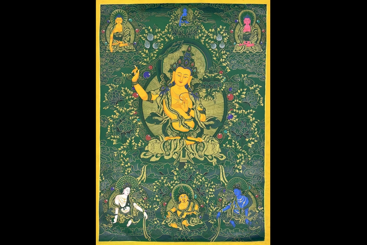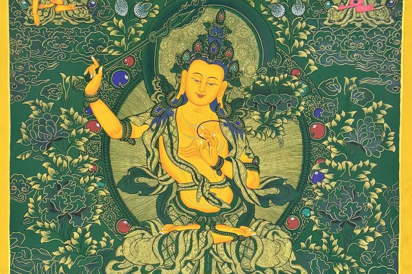 介绍:超精美绿底唐卡【文殊菩萨】!幅面背景祥和深邃,主尊文殊菩萨福德殊胜,笔触画工细腻,实物更漂亮,客厅,书房,办公室,文玩店面装饰首选!