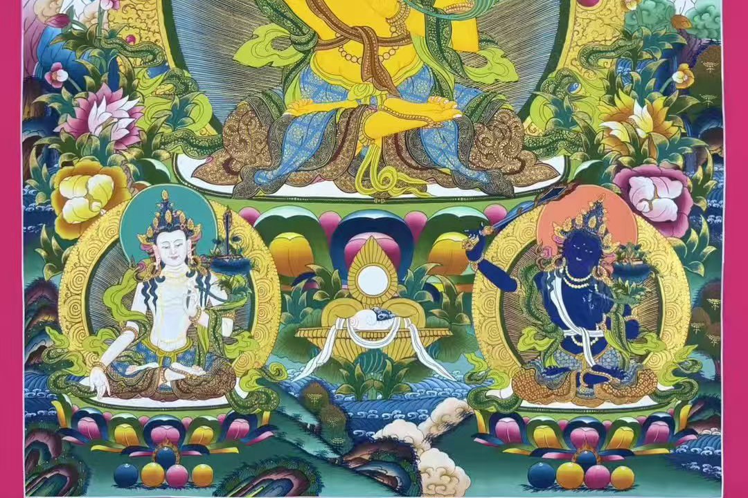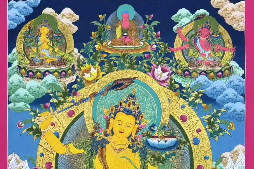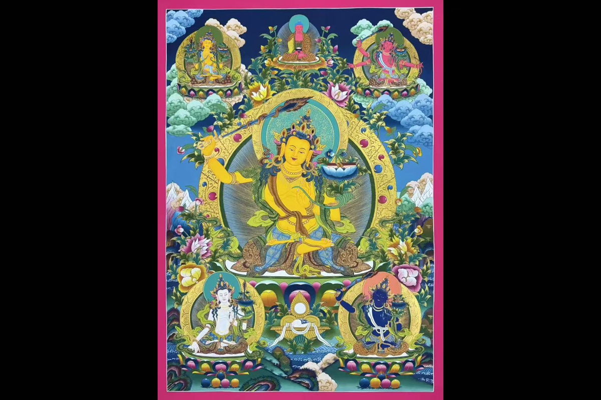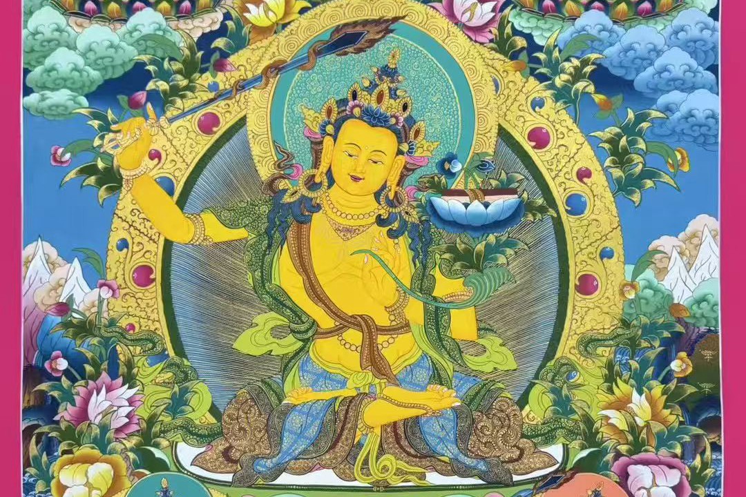 介绍:尼泊尔唐卡大师Babu lama修行绘制,幅面内容丰富,人物众多,满工之作,矿植物颜料、布面材质,主尊开脸栩栩传神,慈悲含笑,肤色晕染饱满自然,鲜活至极,把菩萨的柔美慈悲表现的淋漓尽致,构图精美绝伦,颜色丰富,菩萨周围环绕众多人物形象,刻画精美殊胜。文殊菩萨是如来佛祖怙恃之一。文殊菩萨又称法王子,为智慧之象征,身紫金色,形如童子,五髻冠其项,右手持金刚宝剑(表示智能之利),能斩群魔,断一切烦恼,左手持青莲花,花上有金刚般若经卷宝,象征所具无上智慧,坐骑为一狮子(表示智能威猛)。文殊菩萨是诸佛智慧之化现,可开启智慧,对事业、仕途、学业等极为利好,不管是从商、从政还是居家、求学,也不管自留还是馈赠领导、亲友,这个题材都极为合适,期待有缘人!!