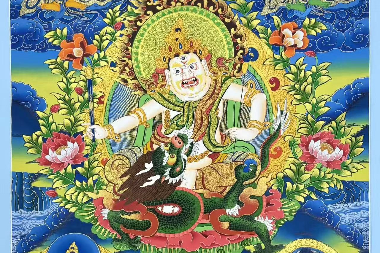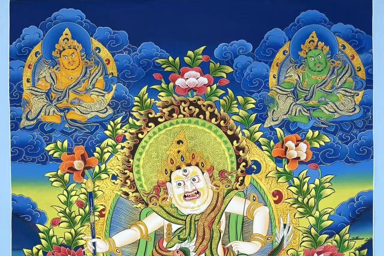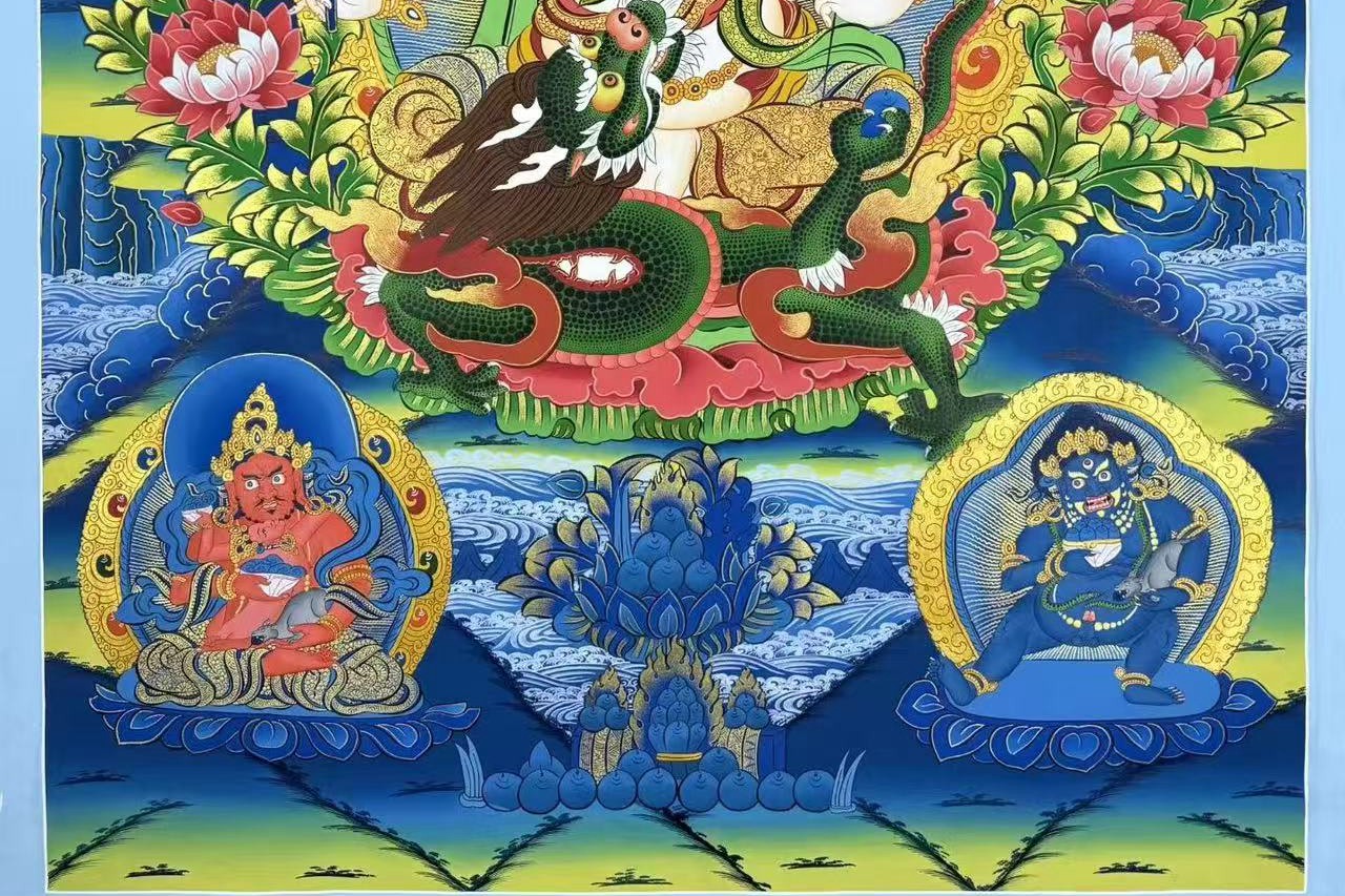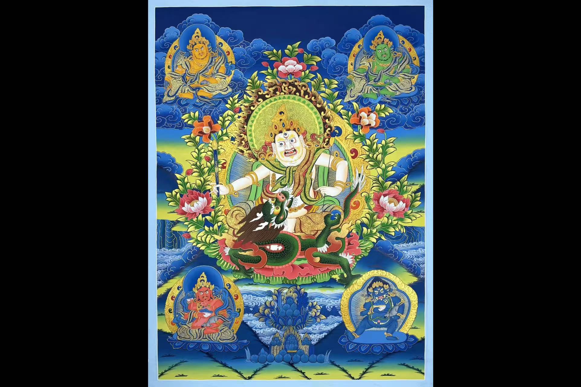 介绍:精品彩绘蓝唐【白财神】-五姓财神,尼泊尔帕坦唐卡名师retish lama作品,,18k金描线,混合矿植物颜料,经典蓝底,大气深邃,幅面人物佛像众多,神情自若各异,主尊凸显,开脸传神,面目自然庄严有神,画工细腻,细节刻画惊赞,描线精细入发丝,主尊白财神!周围其他四位财神。