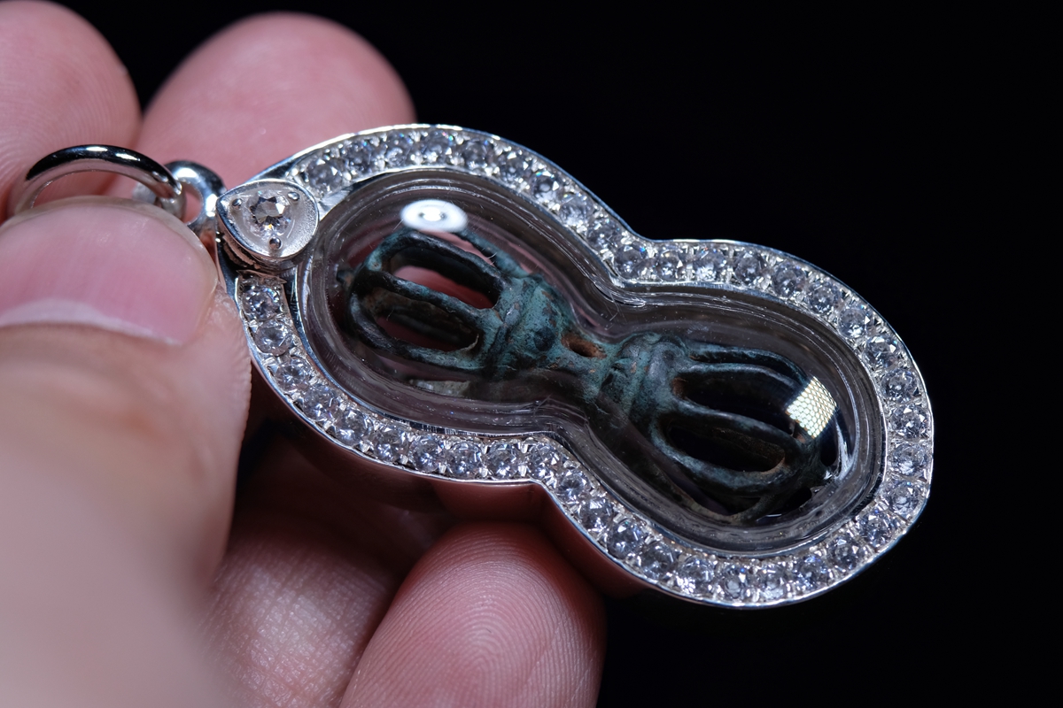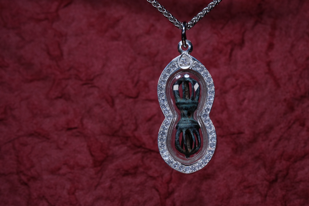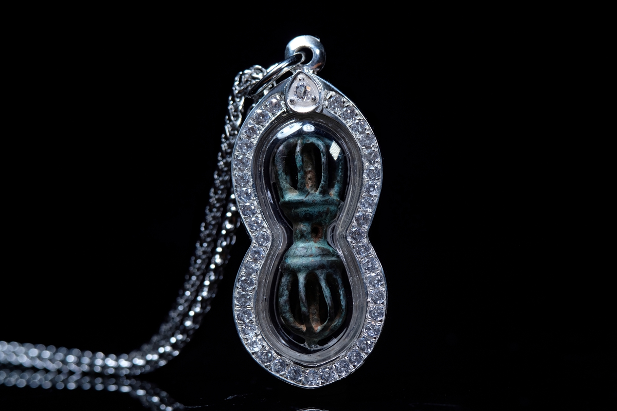 介绍:一眼大开门,极品品相,全品九股金刚杵吊坠,一丁点瑕疵没有,千年传承黑漆股。考虑到材质较脆,为了更好保存和展示,做了防水外壳,925银包边设计,正面满钻效果。独一无二的小杵,加上独一无二的设计,绝对惊艳全场!