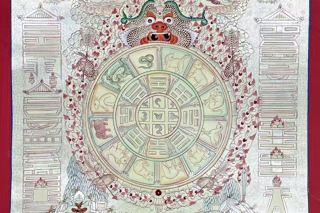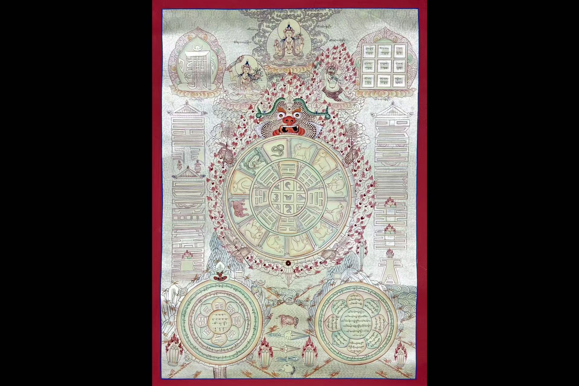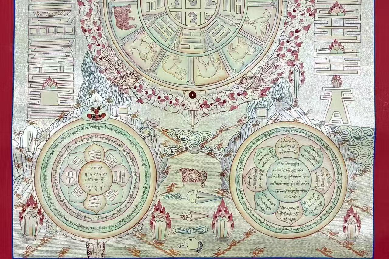 介绍:精品 银箔唐卡【九宫八卦】,此幅唐卡采用涂银玛瑙笔压纹绘制工艺,工序复杂,画工精美,价格合适!九宫八卦图又名“斯巴霍”,意为生死轮回,又称生死轮回图。此图中央画有九宫,并环以八卦之图,周围又用十二属相作配。在此图正上方绘有文殊、观音和金刚手像,藏语通称日松贡布,系密宗之本尊像。在藏传佛教寺院重大宗教礼仪上,原噶厦政府官员升迁以及家中婚丧喜庆等活动,均要用它举拓开道,被视为降魔伏妖、驱邪隐恶的神物。