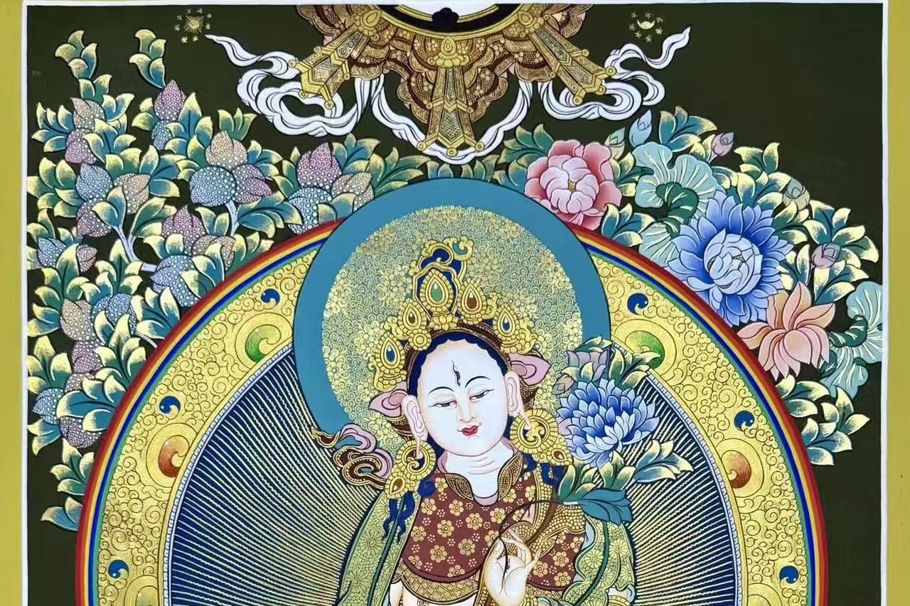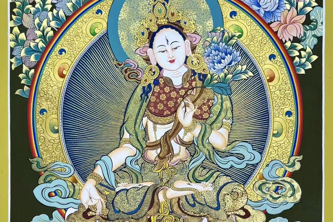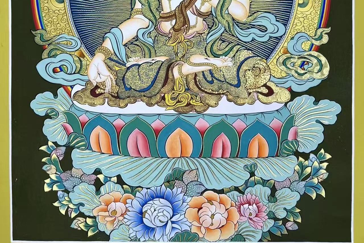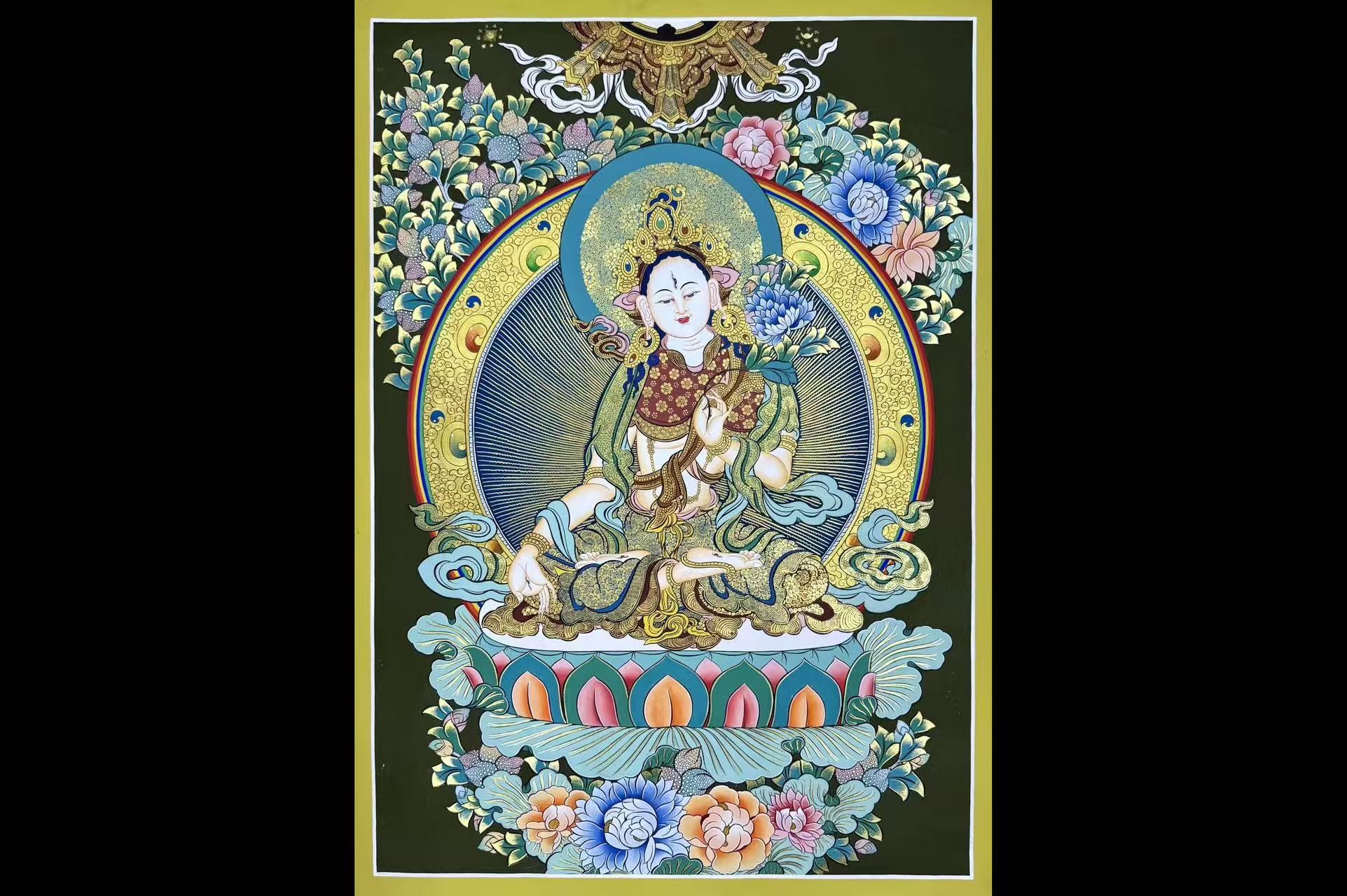 介绍:精品纯金小彩唐 【白度母】左右,尼泊尔知名画师Babu lama作品,此画师在幅面布局、色彩晕染、人物开脸上堪称完美经典,风格可与扎西索朗唐卡媲美,但性价比特别高。主尊宝相传神、布图精美、画工细腻,实物更漂亮。客厅,书房,办公室,文玩店面装饰首选!