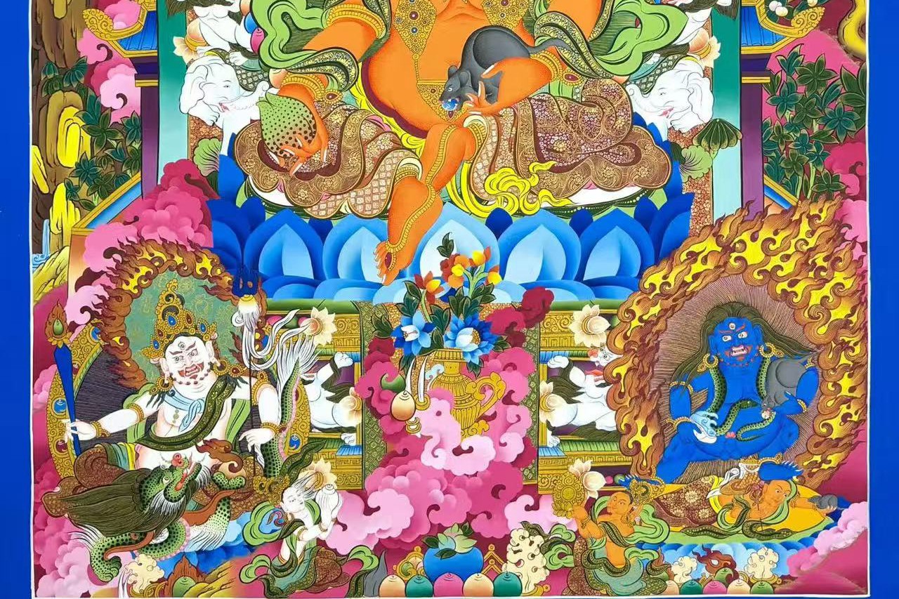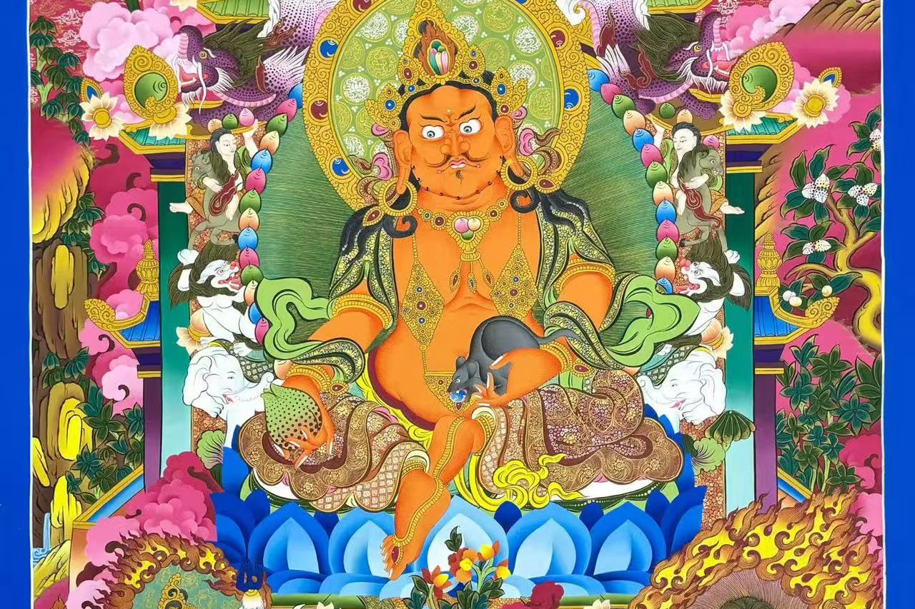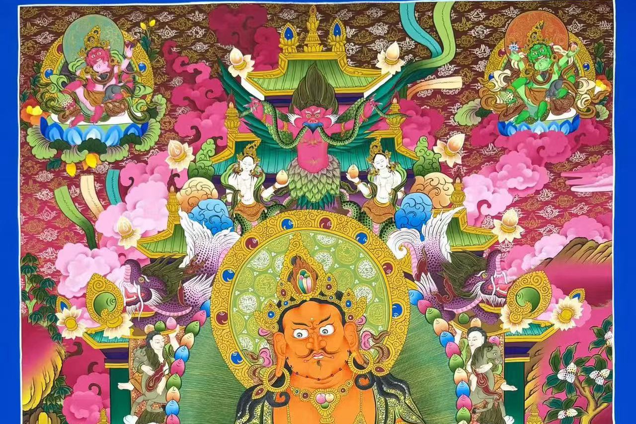 介绍:精品彩唐【五路财神】,纯金描线,上等矿物植物颜料,用金十足,幅面满工画工,人物佛像众多,神情自若各异,主尊凸显,开脸传神,面目自然庄严有神,画工细腻,细节刻画惊赞,描线精细入发丝,可放大镜欣赏。每一尊,每一处细节,都是时间与修行的体现。