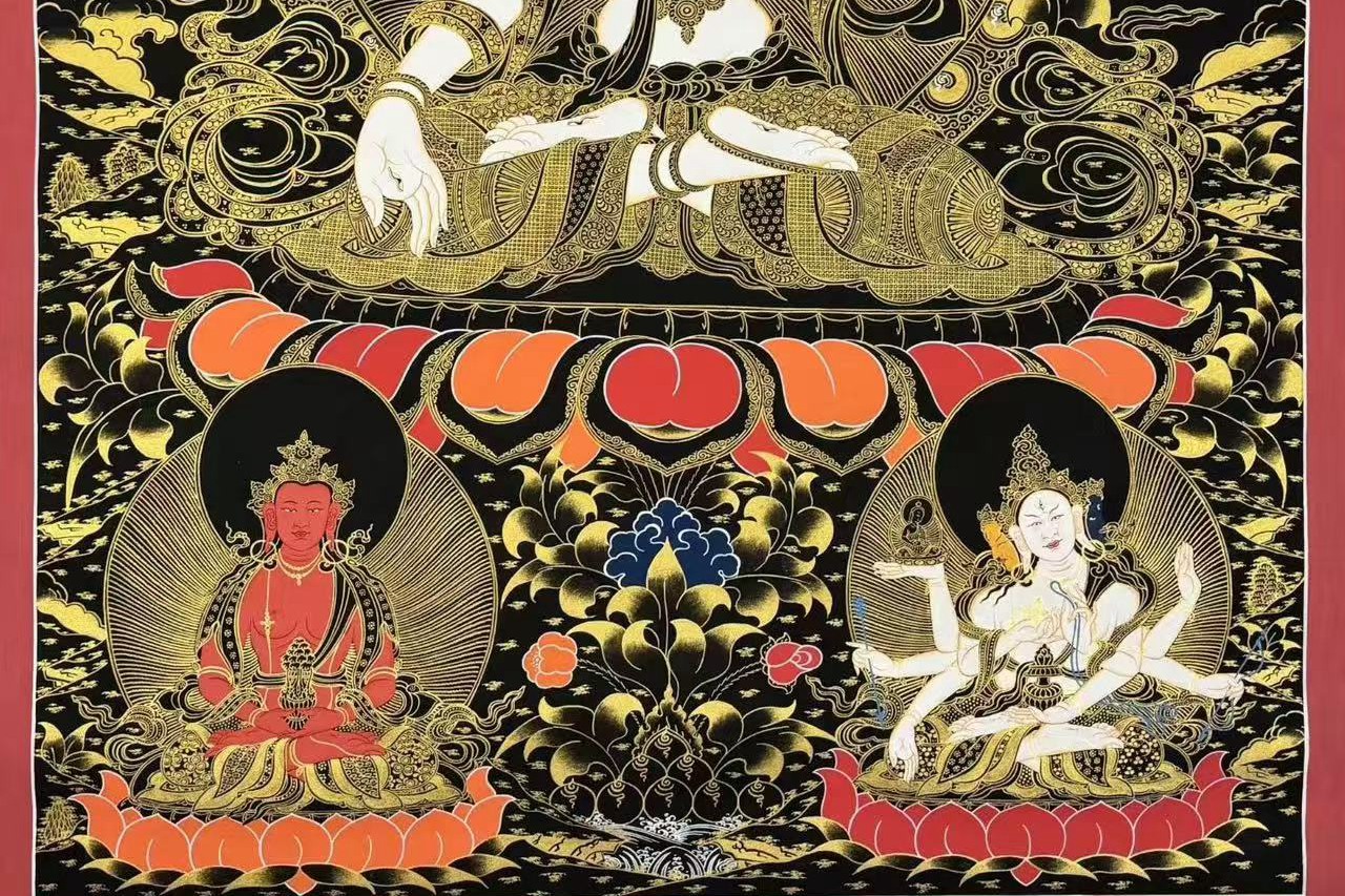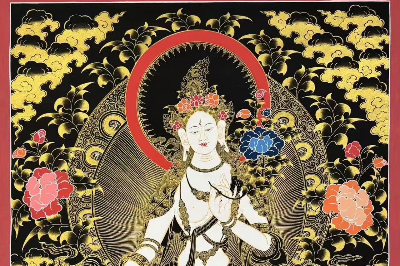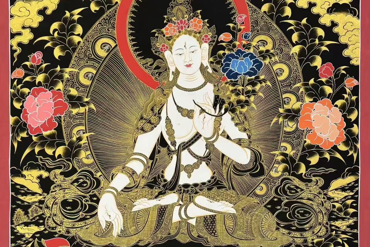 介绍:精美大尺寸黑金唐卡【白度母——长寿三尊】,主尊凸显,开脸庄严,画工精细,笔触细腻,线条柔和匀称,难得的精美高性价比唐卡,收藏供奉首选!