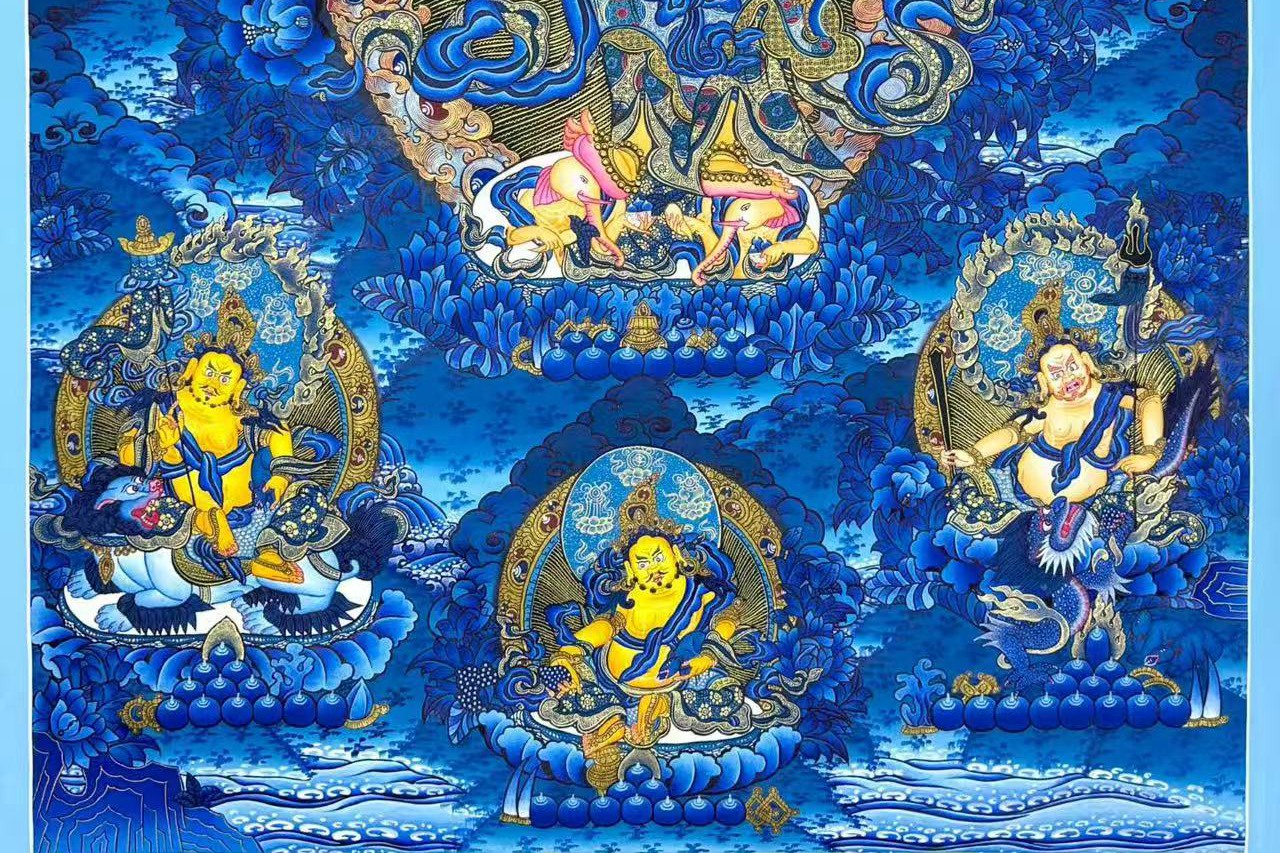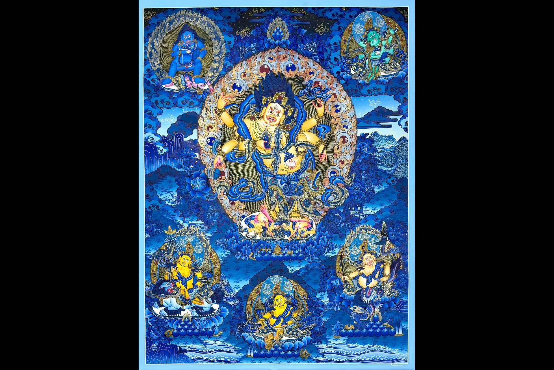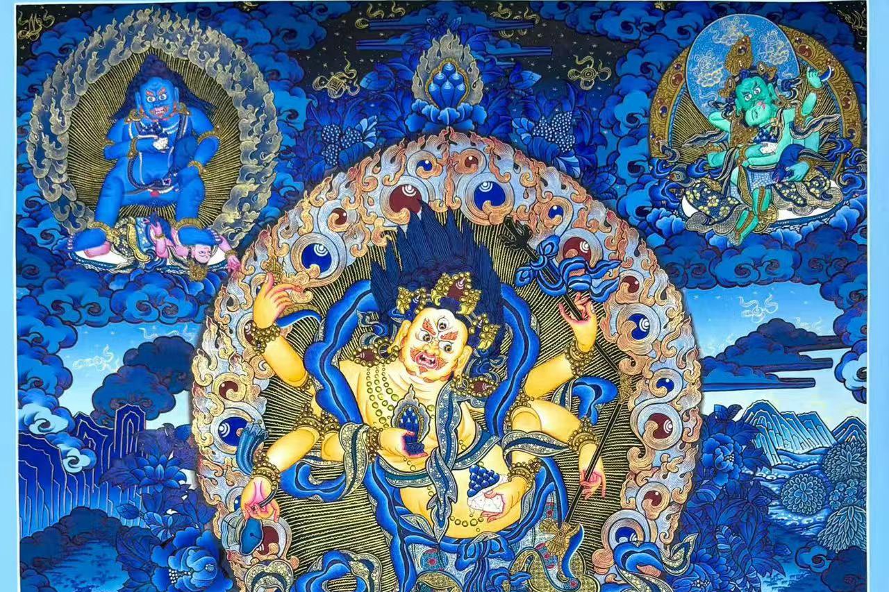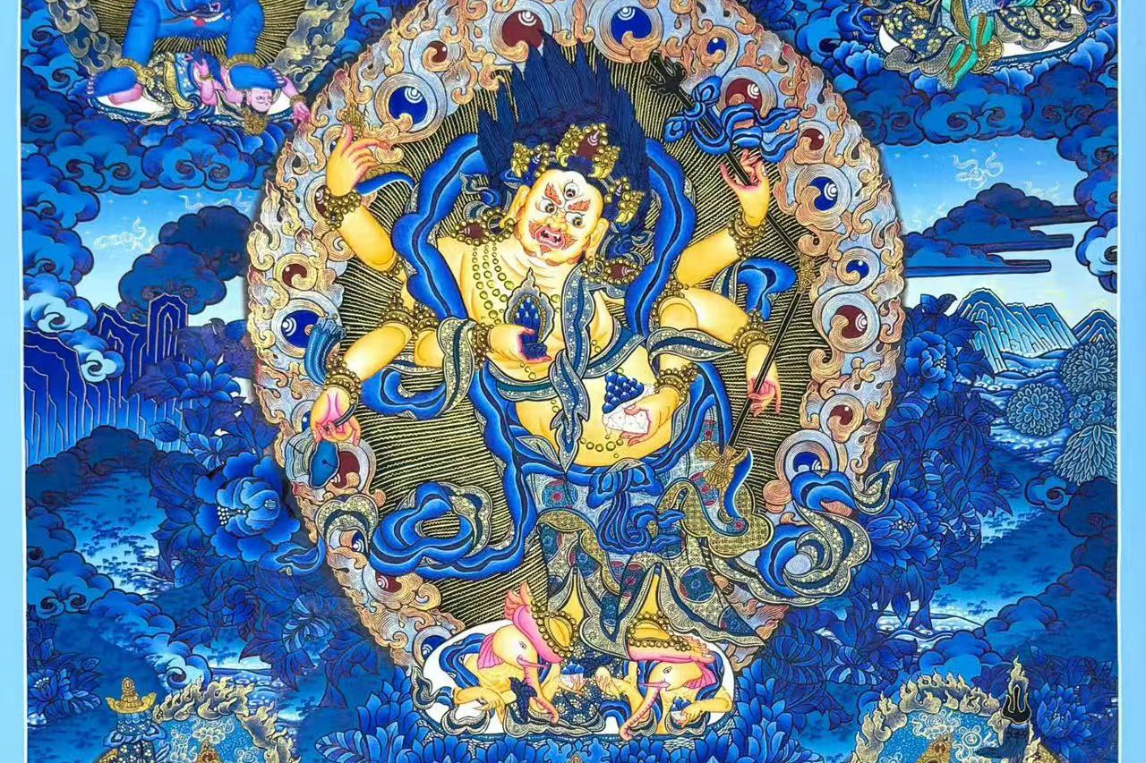 介绍:尼泊尔蓝唐凸金第一人,精品24k金尼泊尔知名画师Pravin lama修行绘制【六臂白玛哈嘎拉】24k凸金工艺 主尊凸显立体,开脸传神, 构图精美绝伦 ,颜色丰富 ,花纹繁多 ,背景珠光宝气, 艳丽无比, 让人视觉感强烈,时刻感受到灵动气息,装饰有格调。六臂白玛哈嘎拉为四臂观音之慈悲化现,可摄受三界一切成就,钩召财富、福德、寿元,增土闻思修三慧,并追随严持密戒之行者,助彼行息、增、怀、诛诸事业。 白勇保护法即白玛哈嘎拉,是玛哈嘎拉的一种变相,为藏传佛教的智慧财宝护法之一。