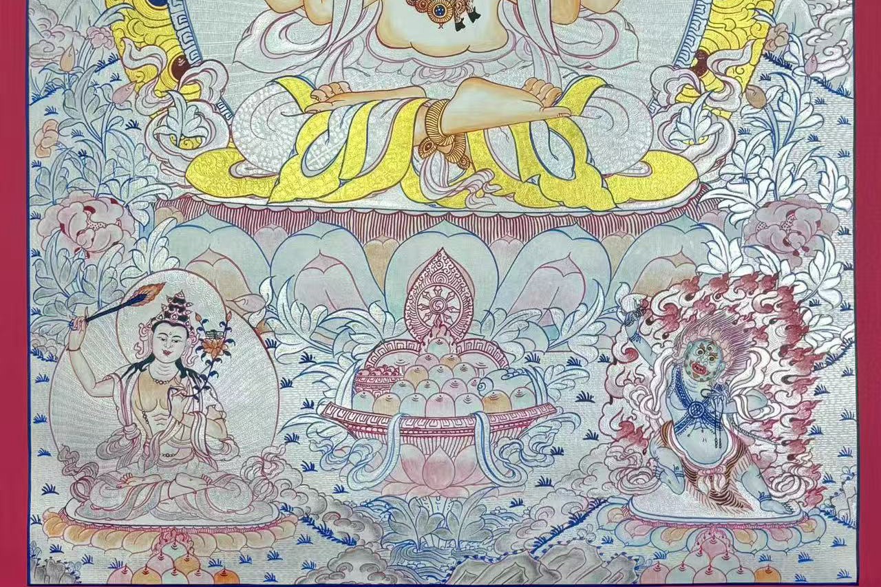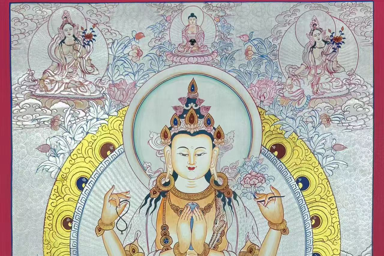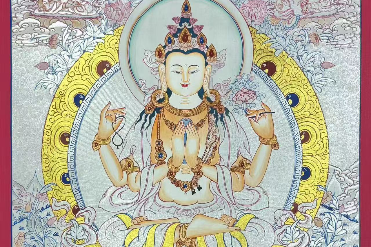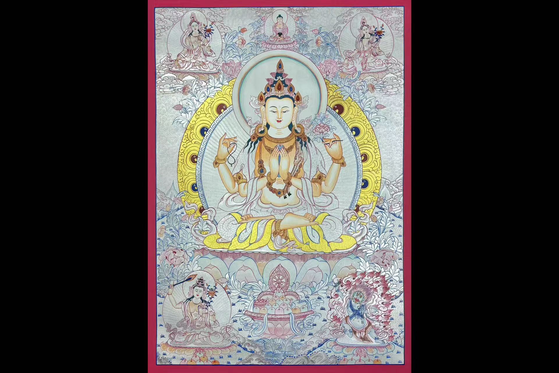 介绍:精品银箔唐卡【四臂观音】,纯银箔雕刻簪花,成名唐卡画师亲工手绘制作,银唐卡传承唐卡文化技艺,作品采用纯银箔玛瑙笔雕花錾刻,矿石颜料上色完成,绘制周期漫长,银光闪闪,制作工艺极为复杂繁琐,非常少见,作品工艺精湛,雕刻精美,画工细腻,开脸十分庄严柔美,喜欢收藏唐卡的朋友一定不要错过