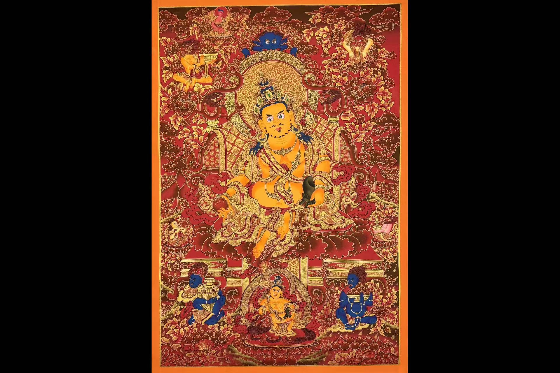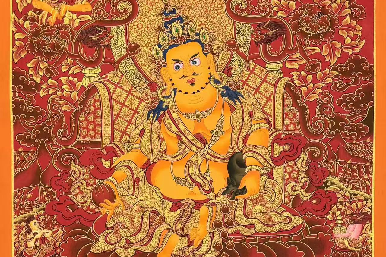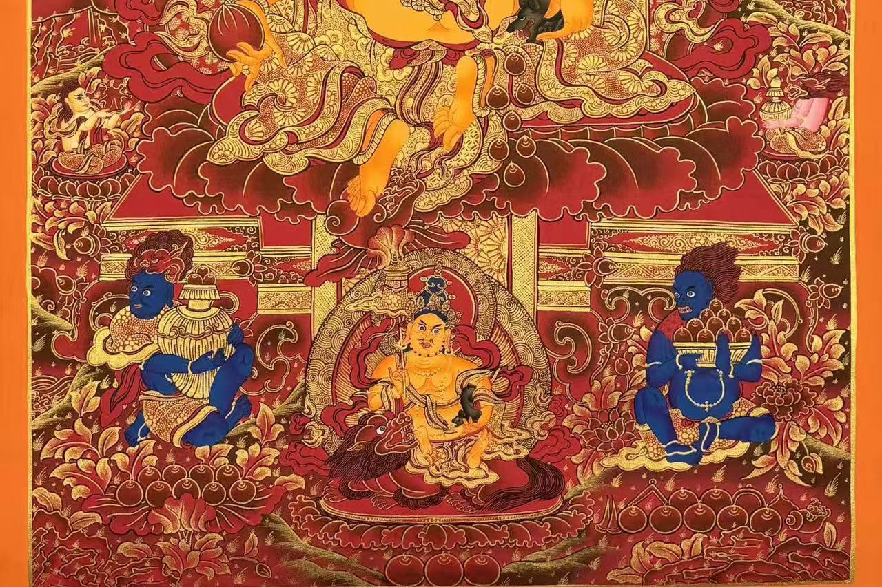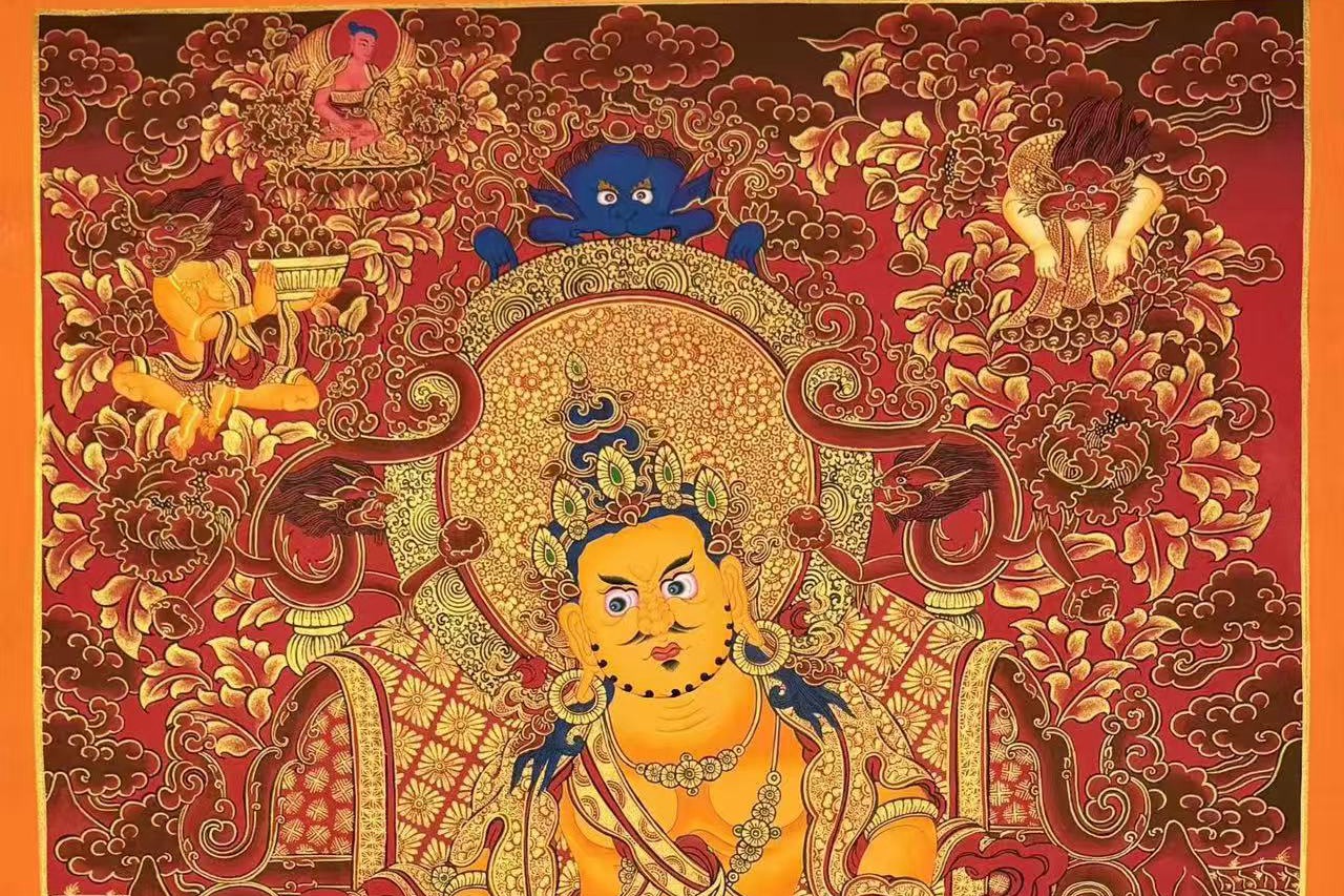 介绍:高性价比精美红唐【黄财神】,幅面布局大气,底色吉祥喜庆搭配同时主尊更加凸显,整幅唐卡色彩祥和艳丽,晕染过渡自然流畅,画工细腻,纯金描线细腻流畅,金光闪闪,主尊开脸庄严传神,面容福德吉祥。
