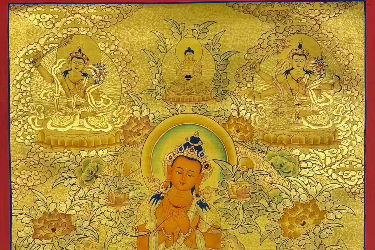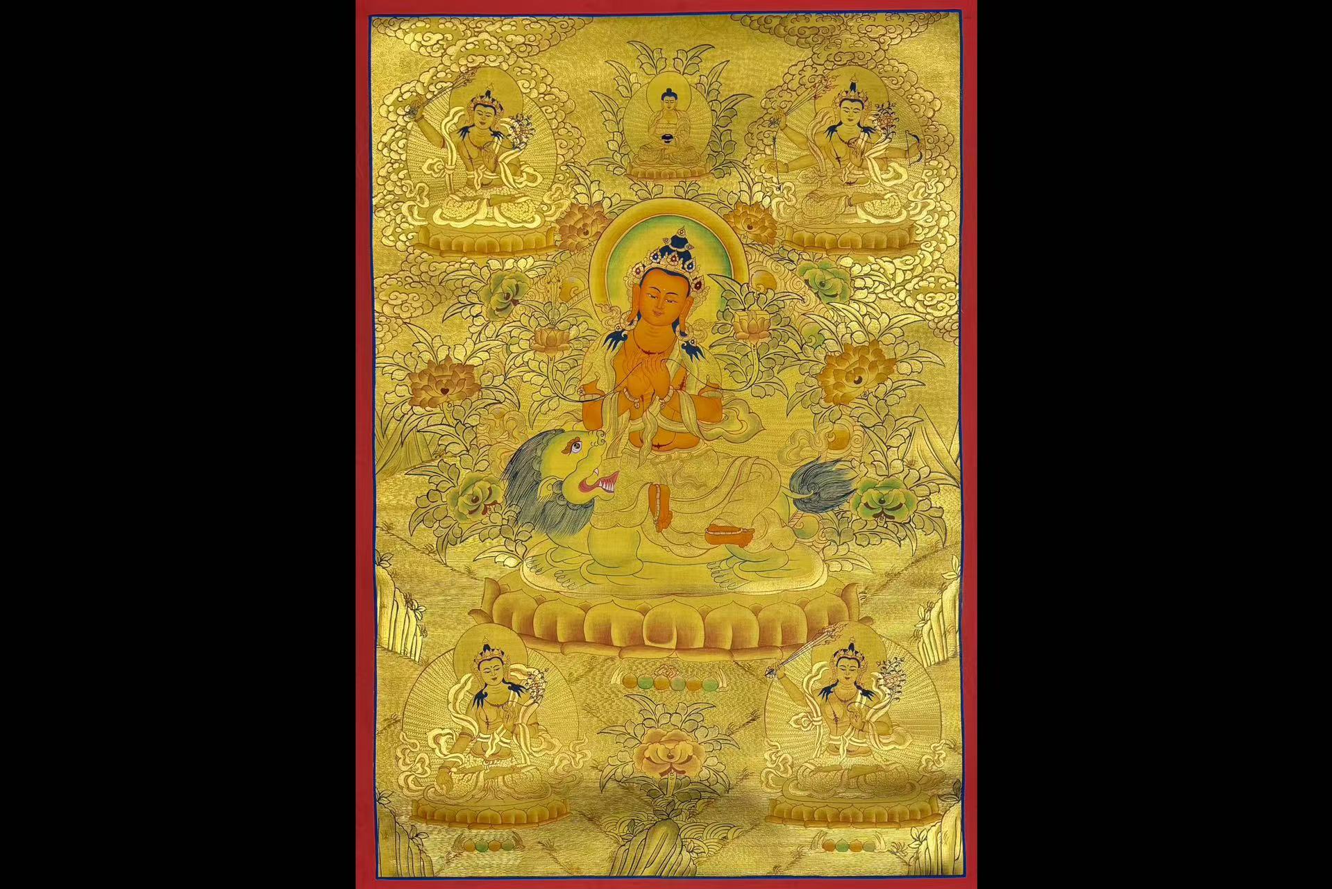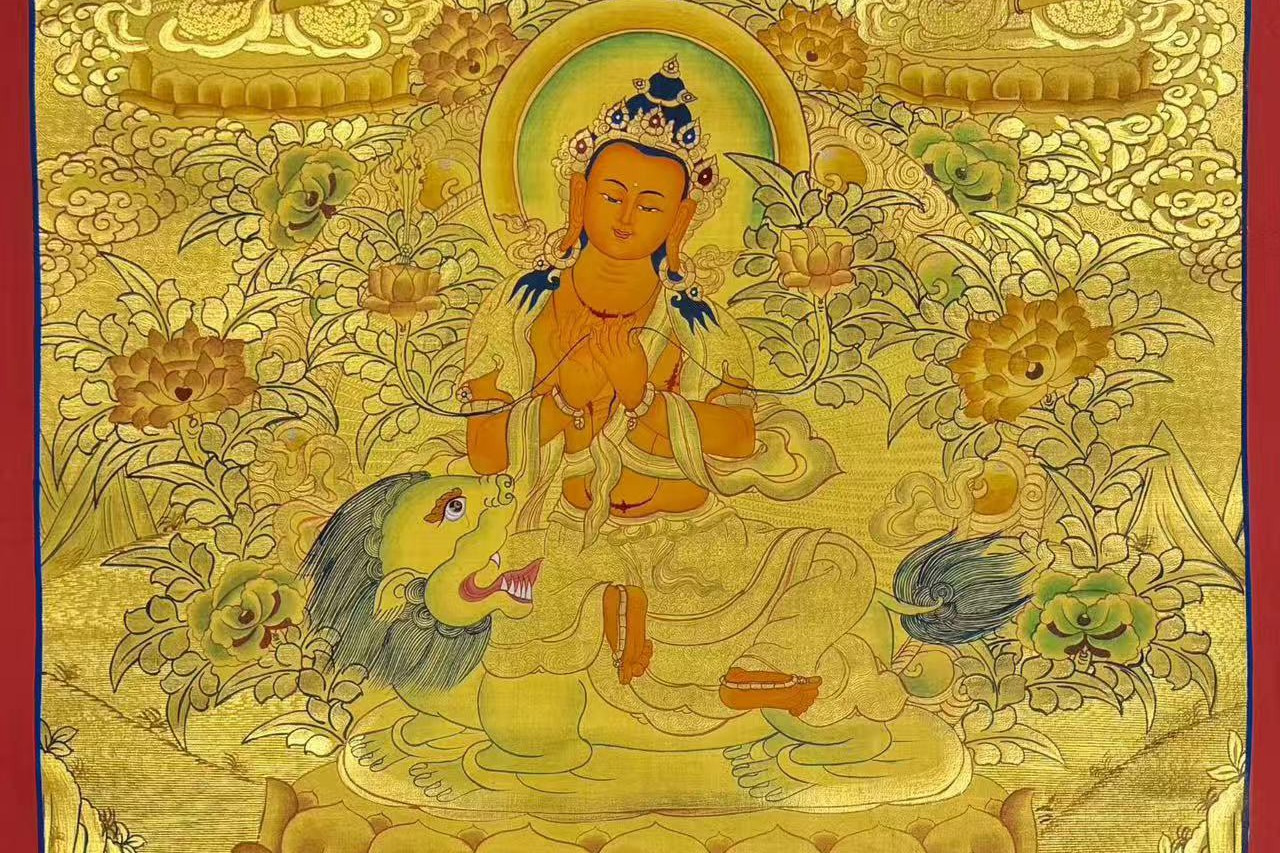介绍:手绘超性价比金箔唐卡 【文殊菩萨】,布局大气,画工细腻,玛瑙刀暗花雕刻,主尊文殊开脸庄严传神,肤色晕染干净纯粹,幅面金光闪闪,实物更漂亮,恭请结缘!