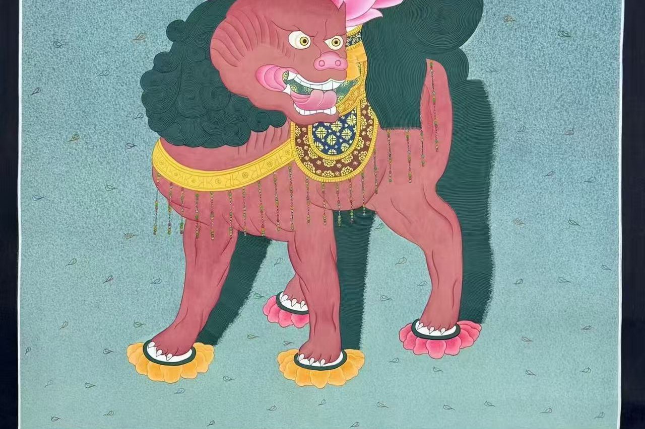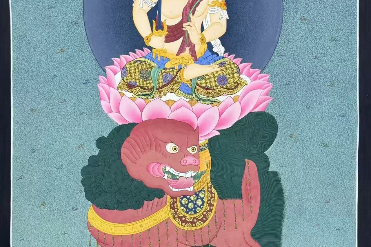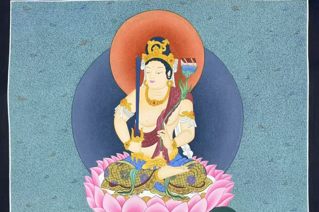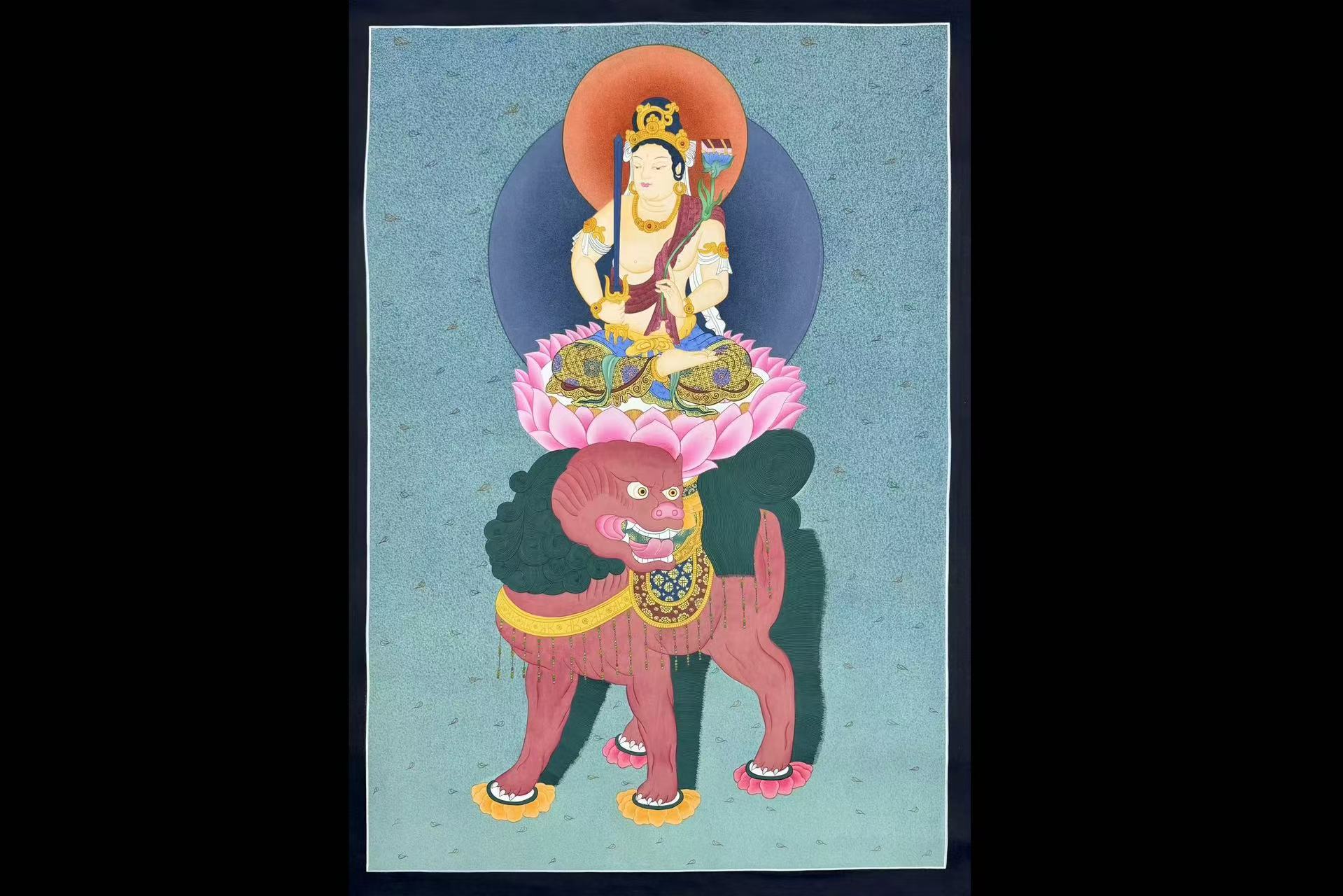 介绍:那葛王喇嘛工作室纯手工绘制 【六字真言吉祥八宝坛城】,作品幅面满工丰富,佛教吉祥图腾生动环绕,生动传神,经文流畅,画工精细,描线细如发丝。