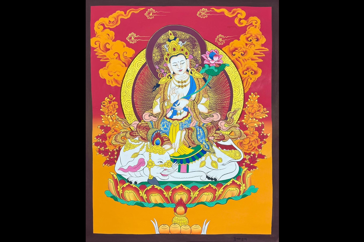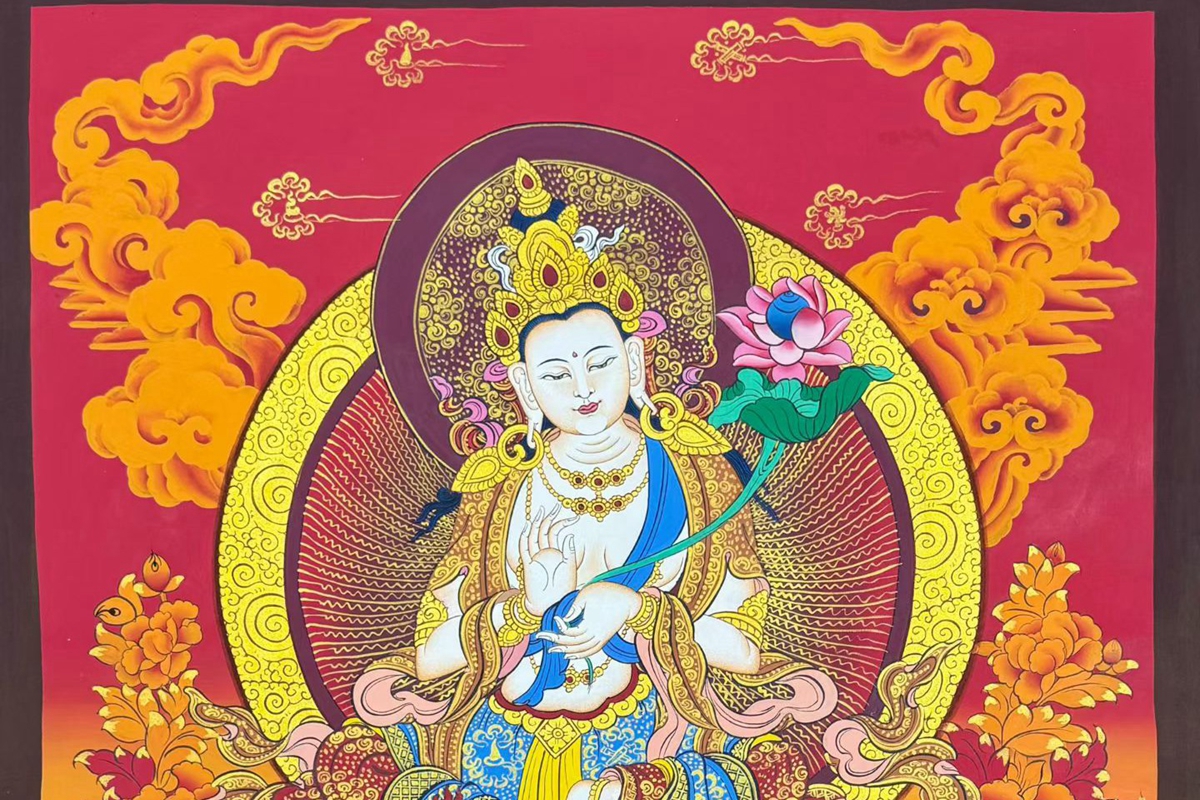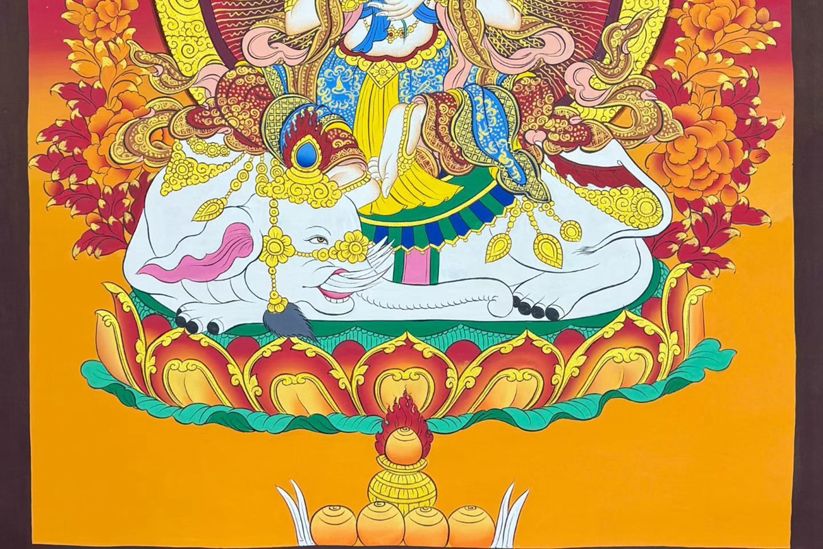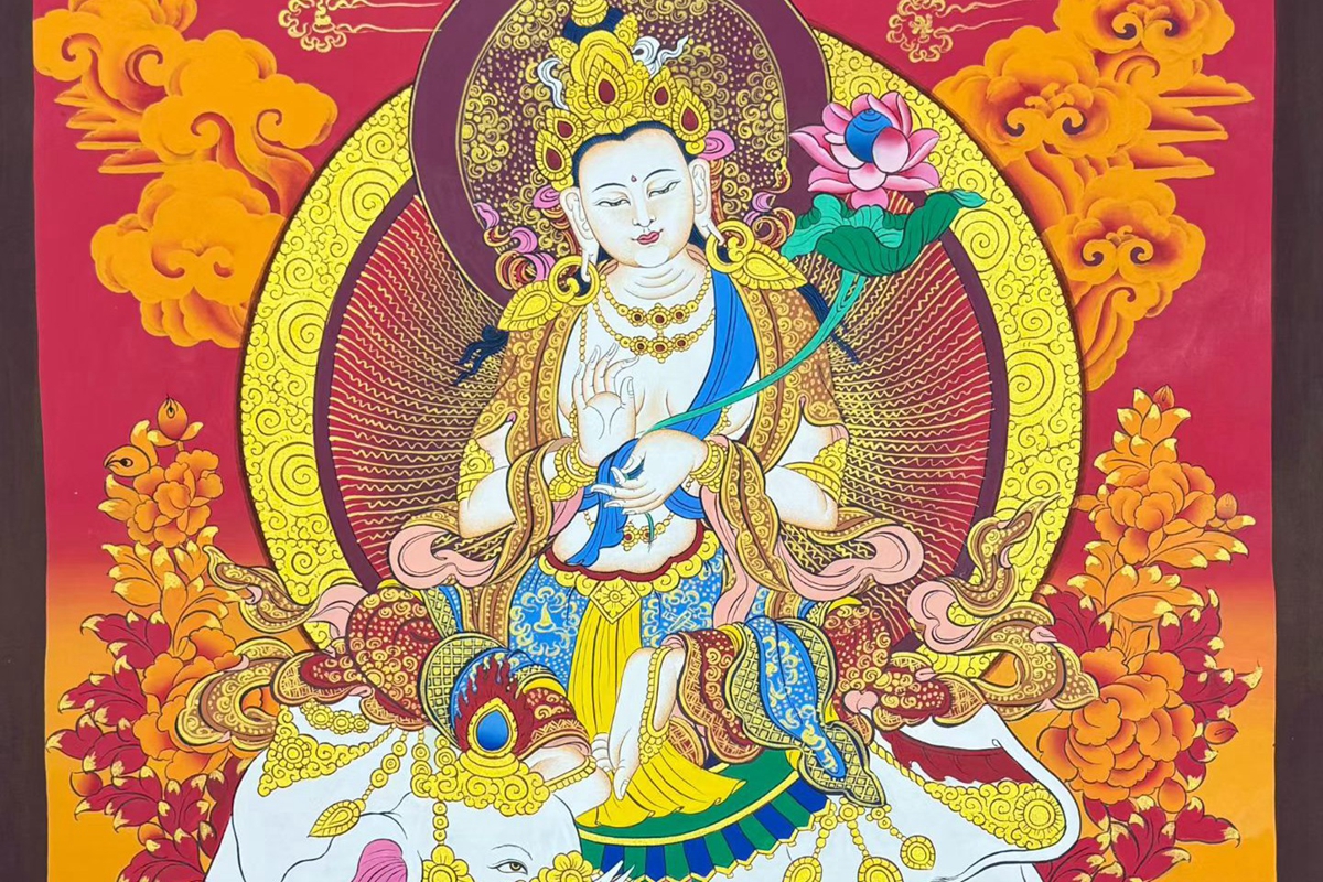 介绍:精品红底彩唐【普贤菩萨】,尼泊尔画师洛桑扎西新品!此幅唐卡采用矿植物颜料绘制,画工精湛,画工普贤菩萨盘坐于象背的莲花座上,法相庄严殊胜, 普贤菩萨 是大乘佛教的四大菩萨之一,象征着理德、行德,与象征着智德、正德的文殊菩萨相对应,同为释迦牟尼佛的左、右胁侍。此外,大日如来、文殊菩萨、普贤菩萨被尊称为“华严三圣”。此外普贤菩萨具有延命益寿之不可思议的力量。普贤菩萨是理德和大行愿的象征,象征真理。他以智导行,以行证智,解行并进,完成求佛者的志愿,所以又称“大行普贤菩萨”。