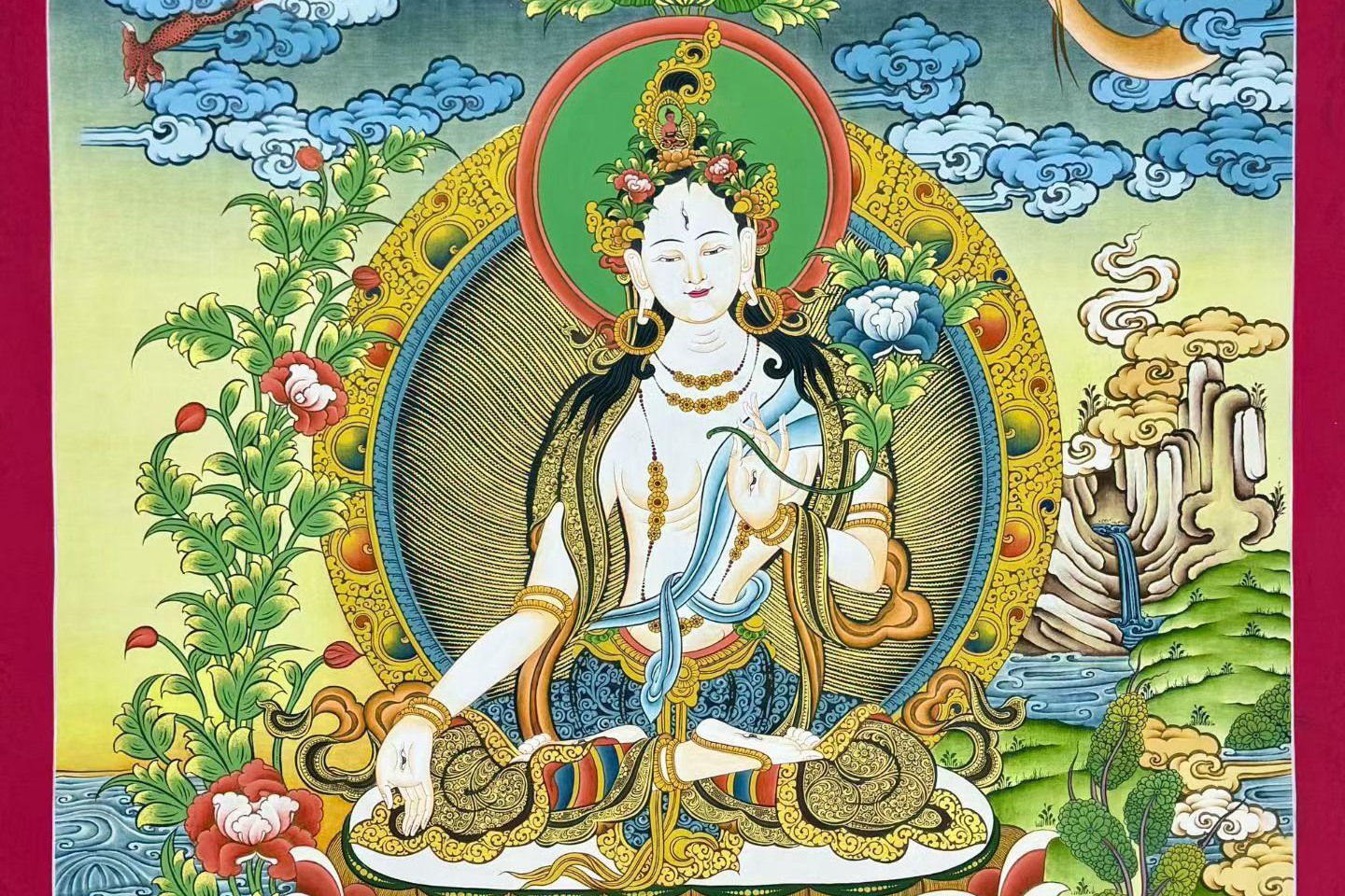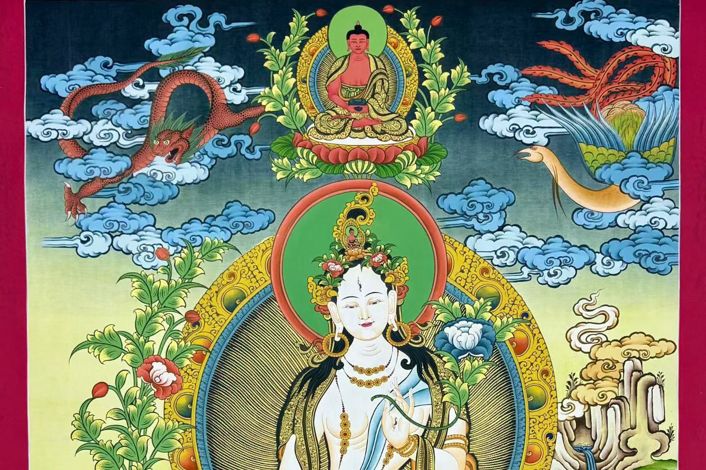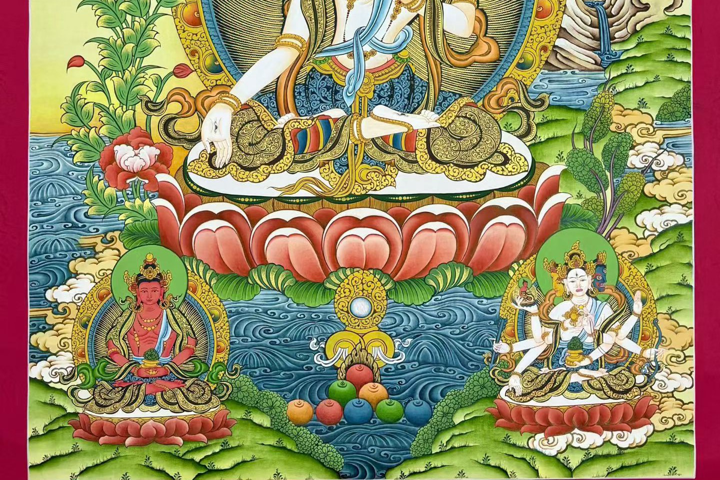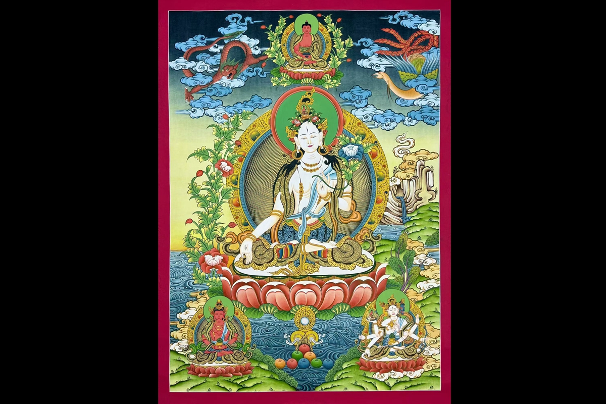 介绍:精品彩唐【白度母】,矿植物颜料,金粉描线,幅面布局大气,内容丰富,佛菩萨众多,中央主尊面如冠玉,双目炯炯有神,肤色晕染自然,身形丰腴饱满,法相传神,豪华满工构图,画面熠熠生辉!度母开脸慈悲传神,眼露慧光,线条勾勒纯熟流畅,衣饰飘逸、佛光一气呵成毫无顿挫,菩萨的衣饰、花纹极为精致细腻,莲花月台下的花朵怒放,似有灵气,把度母的形象烘托得十分到位,意境深邃,整个背景情景交融,宛如一幅精妙绝伦的山水画,强烈推荐请回家看实物细节之精美震撼,难得的精品,仅此一幅,不容错过,恭请结缘。
