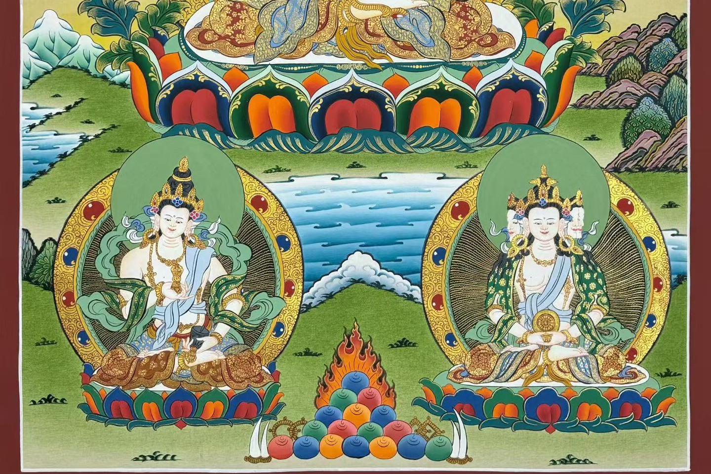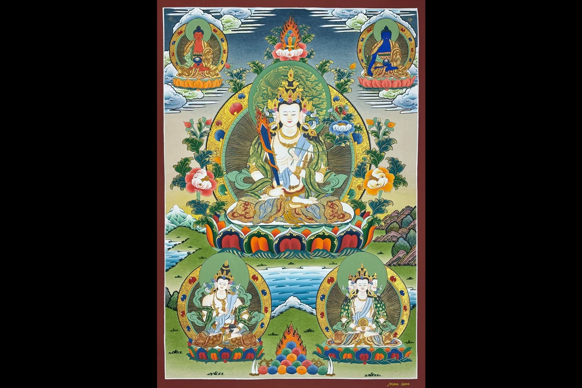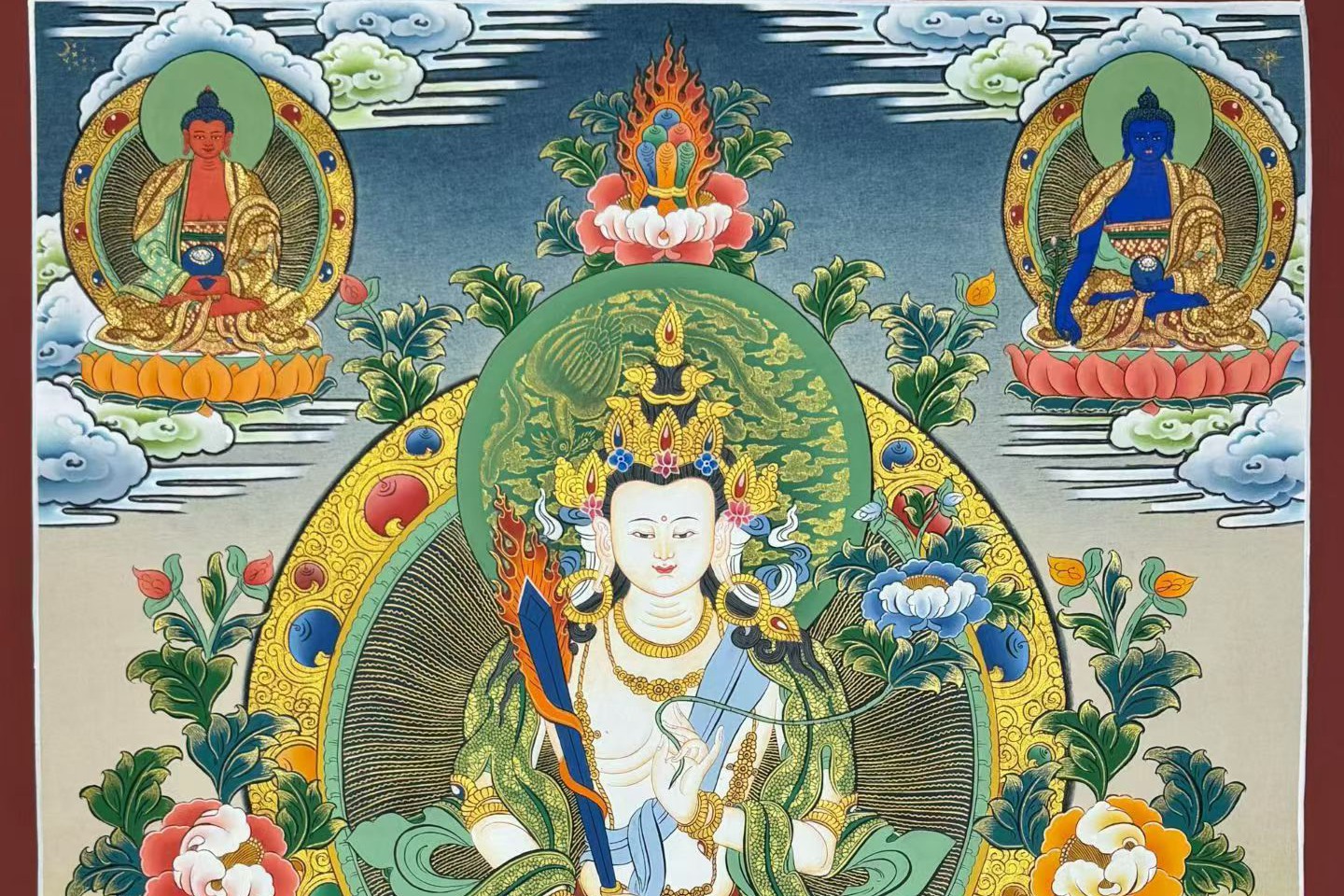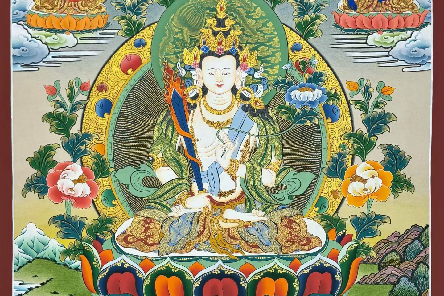 介绍:Nema lama大师亲工手绘,作品风格别具一格,整幅画作采用上等矿植物颜料晕染,开脸非常写实生动,给人眼前一亮的感觉,形象生动自然,主尊的衣饰、法器甚至于指尖足尖等细节都刻画得近乎完美,造像严谨如法,大家可以对照我们拍摄的细节图慢慢欣赏,大师的笔法极为纯熟,线条细腻流畅,描金精美繁复,环境晕染生动,不论您是恭请供养,或是馈赠亲友领导,都是佳品,静待功德主结缘