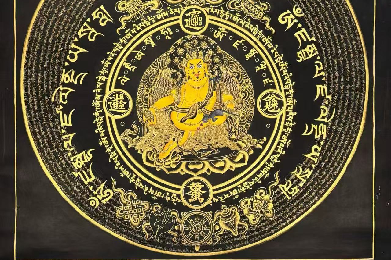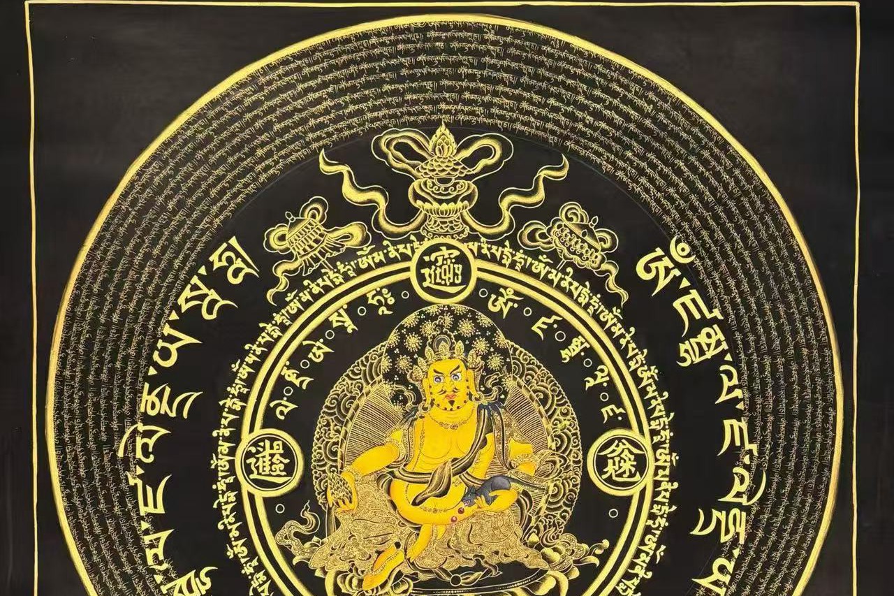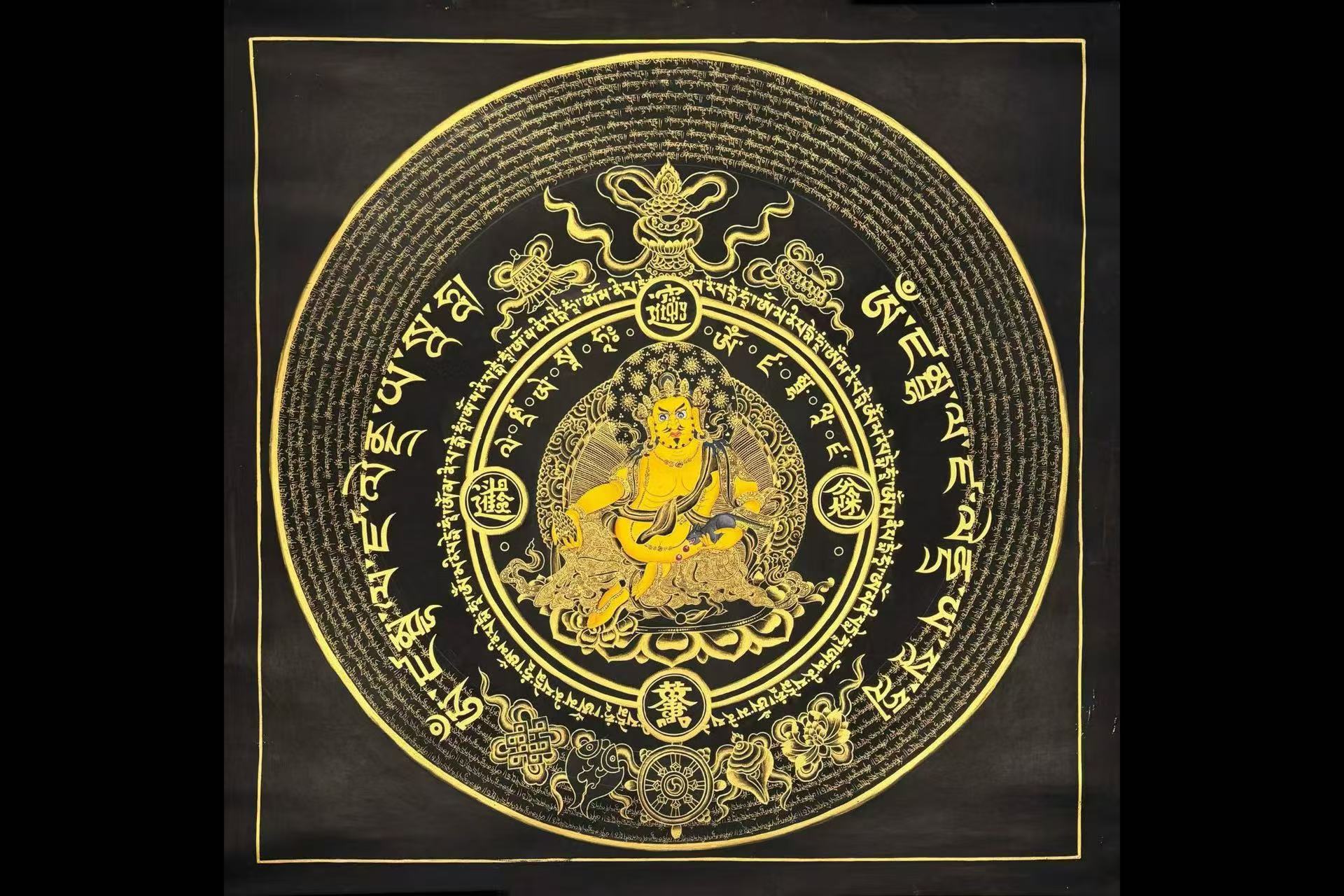 介绍:那噶王喇嘛工作室最新出品,文创系列招财坛城【黄财神】, 内圈主尊黄财神凸显立体,开脸传神,霸气外露,主尊周围诵经书写黄财神心咒“嗡,占巴拉,杂勒扎耶,唆哈” 。 结合中国传统组合字“八方来财,“招财进宝”“日进斗金”“万事如意”四方镇守。中圈遥相呼应佛教吉祥八宝图案与黄财神心咒相间。最外圈心咒圈圈环绕,寓意平安顺遂,家庭美满,事业有成,团团圆圆。整个设计新颖,巧妙构思,布局有序,真的是简约而不简单,仅此一幅,静待有缘人