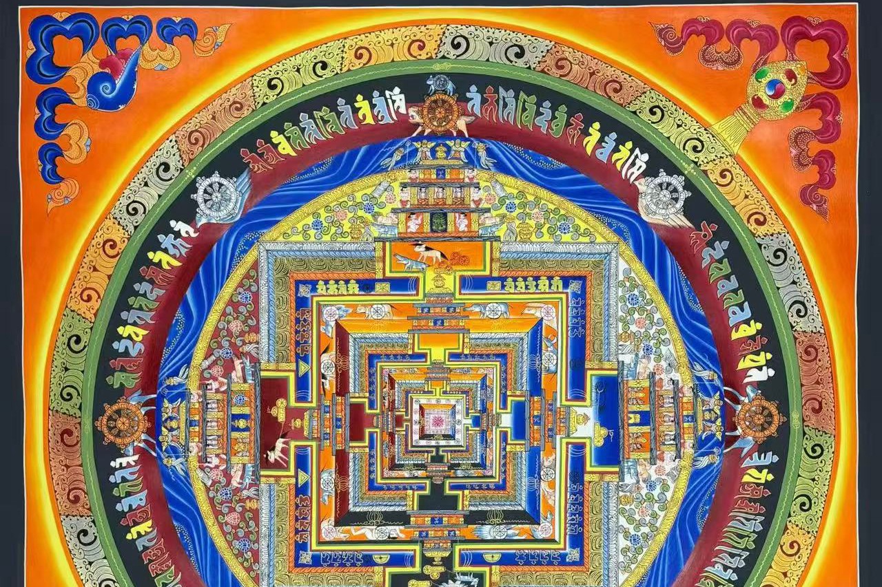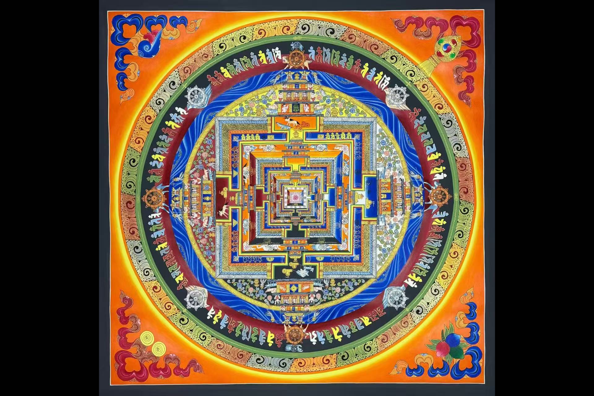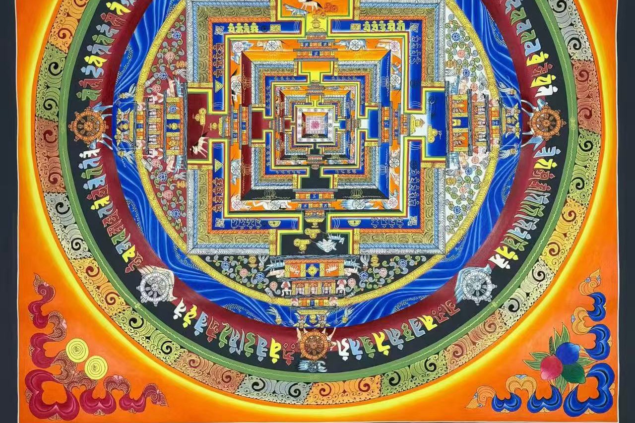 介绍:【时轮金刚坛城】,布面纯手绘作品,颜色细腻,线条流畅,间隔均匀,描金细密,晕染自然,整个画面色彩丰富,金光闪闪。