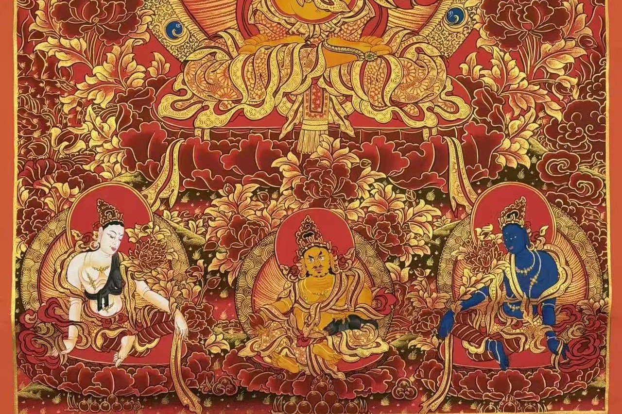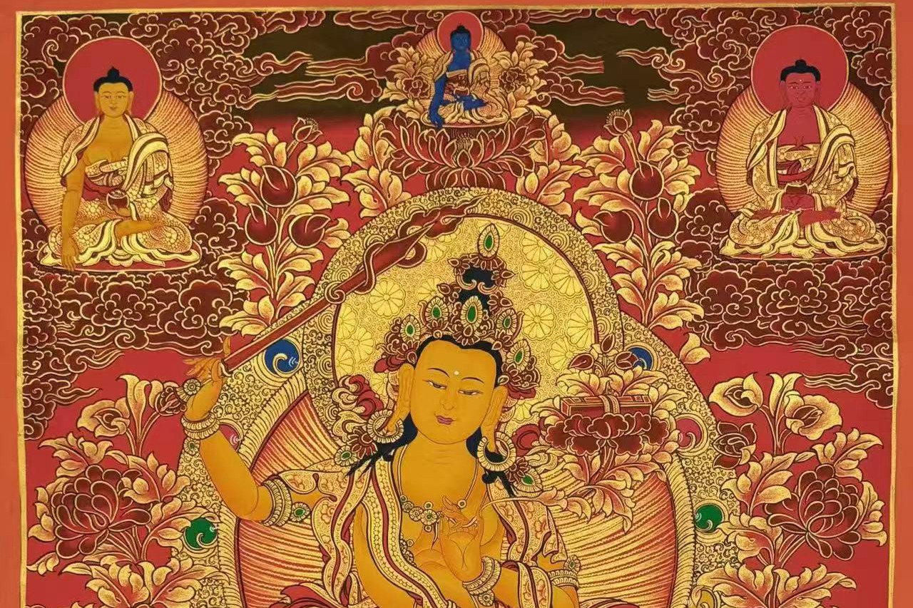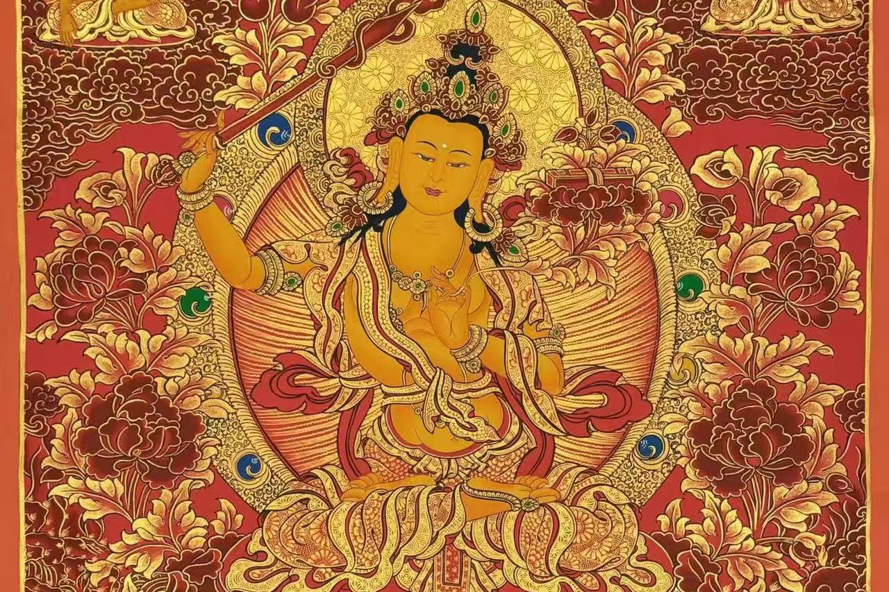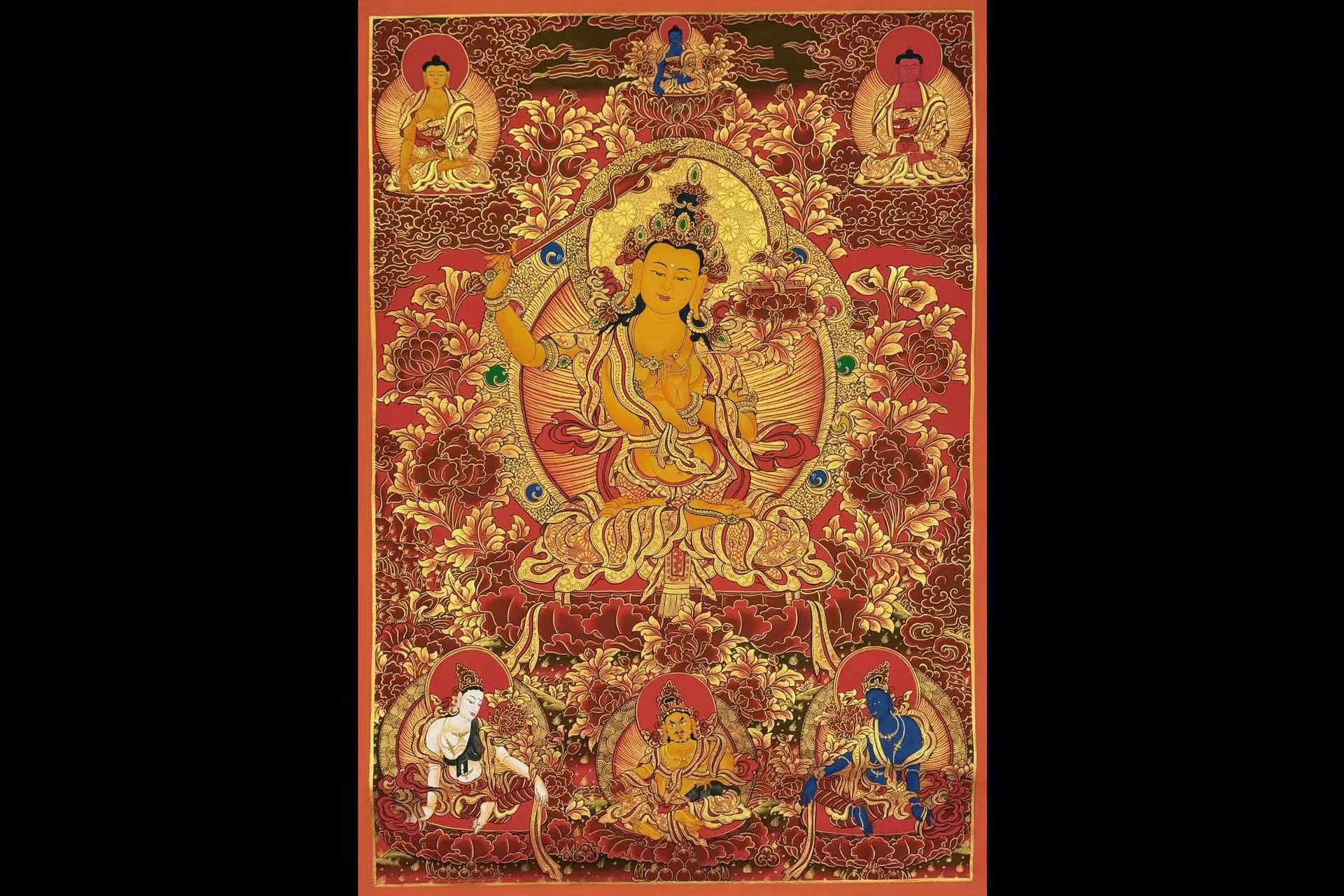 介绍:超精美画风 朱砂红唐卡【文殊菩萨】!Buddha lama 诵经手绘 幅面背景祥和深邃,主尊凸显,宝相庄严唯美,主尊文殊菩萨福德殊胜,笔触画工细腻,实物更漂亮,客厅,书房,办公室,文玩店面装饰首选!加持力巨大!文殊菩萨又称法王子,为智慧之象征,身紫金色,形如童子,五髻冠其项,右手持金刚宝剑(表示智能之利),能斩群魔,断一切烦恼,左手持青莲花,花上有金刚般若经卷宝,象征所具无上智慧,坐骑为一狮子(表示智能威猛)。