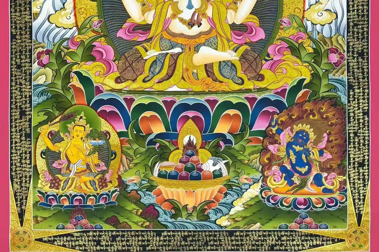 四臂观音是雪域西藏的守护神,藏人由老至幼家家户户,皆吟诵其六字大明咒:“嗡嘛呢叭咪吽”。四臂观音舆文殊菩萨、金刚手菩萨,合称三族姓尊.代表大悲、大智、大力,为密乘行者人人必修的法门。难得精品,恭请结缘!