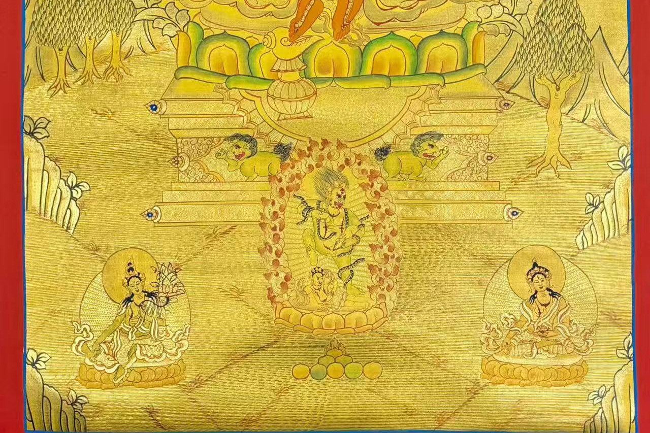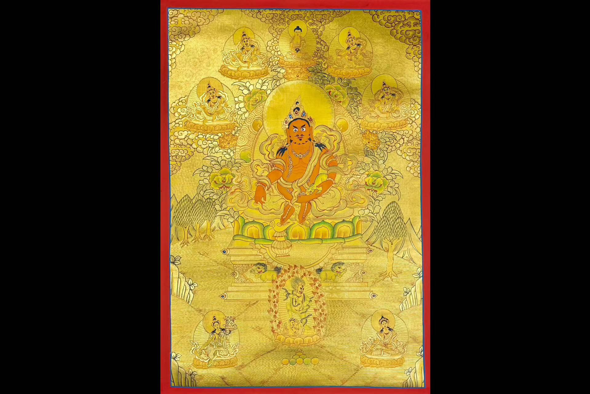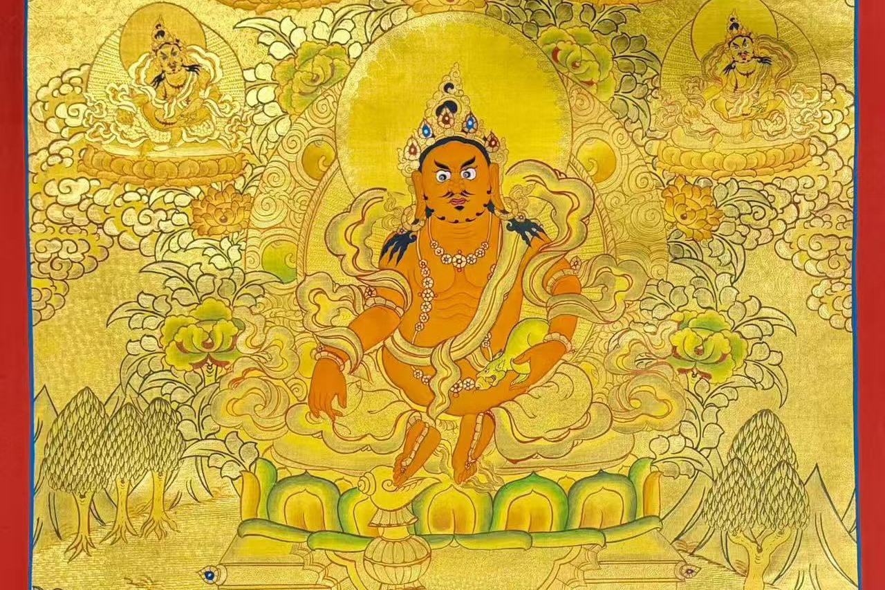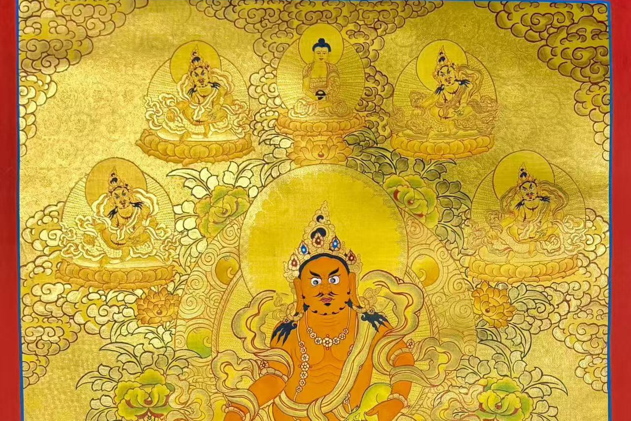 介绍:精品满工金箔唐卡《五路财神》唐卡手绘布本。此作品采用纯金箔玛瑙笔雕花錾刻,混合矿植物颜料上色完成,绘制周期漫长,十分难得。