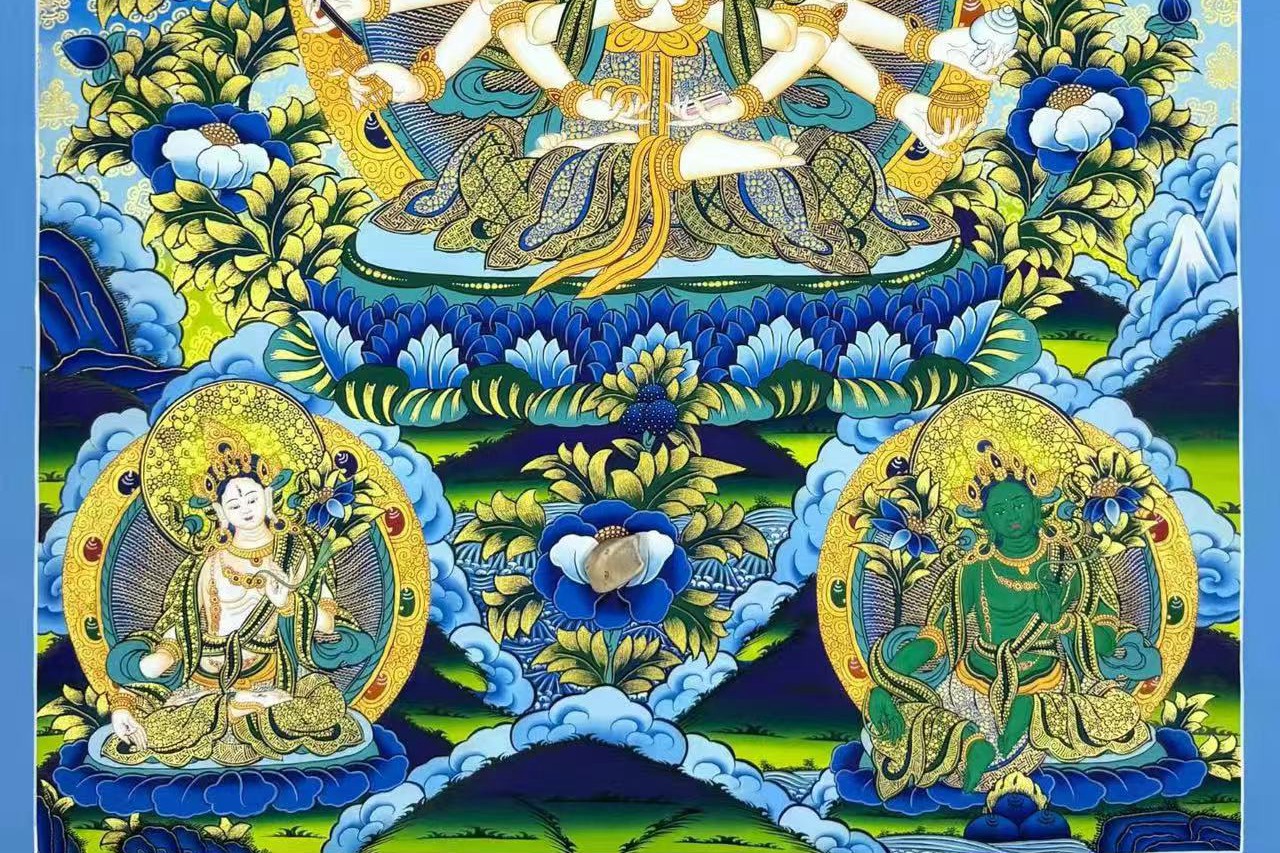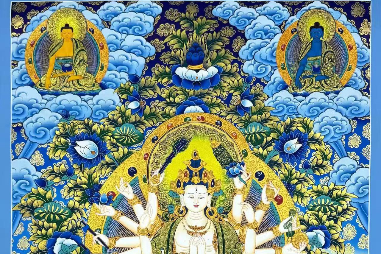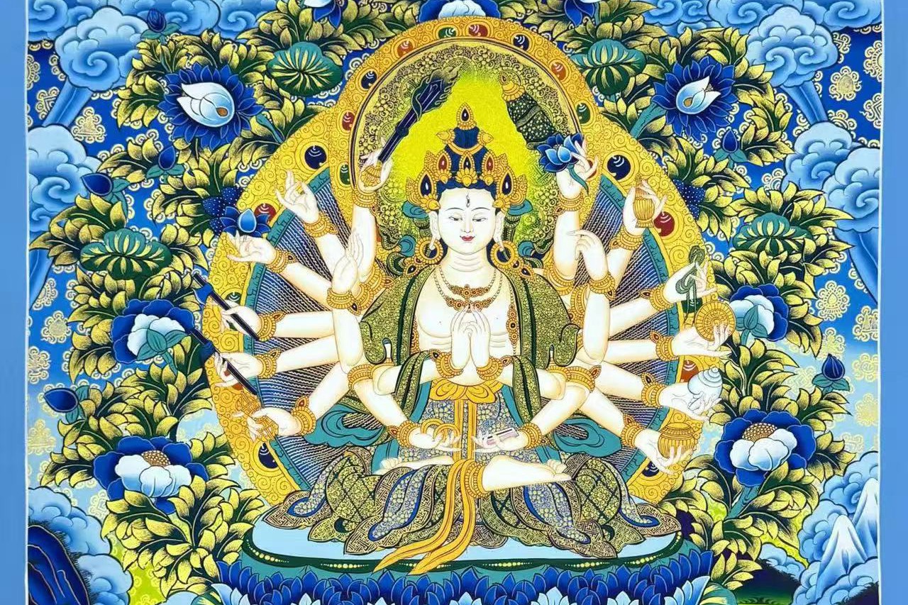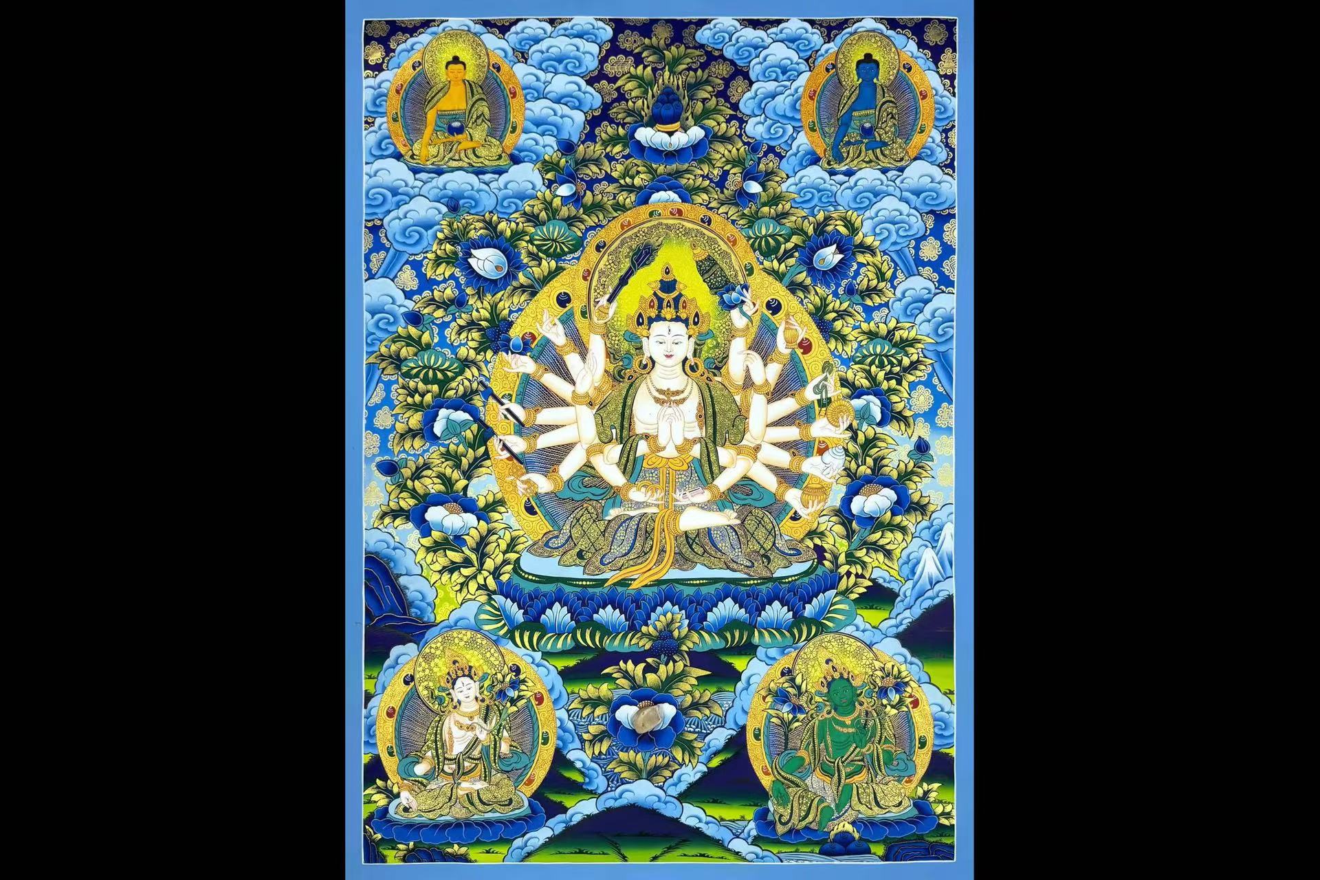 介绍:精品蓝唐【准提佛母】,由尼泊尔名师Ritesh lama纯手工绘制。主尊宝相庄严,开脸慈悲殊胜,幅面色彩斑斓,晕染自然流畅。线条勾勒工整细腻,人物神态传神动人,是兼具艺术价值与信仰加持的收藏佳作。