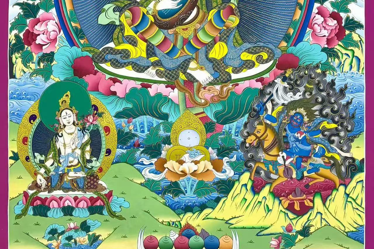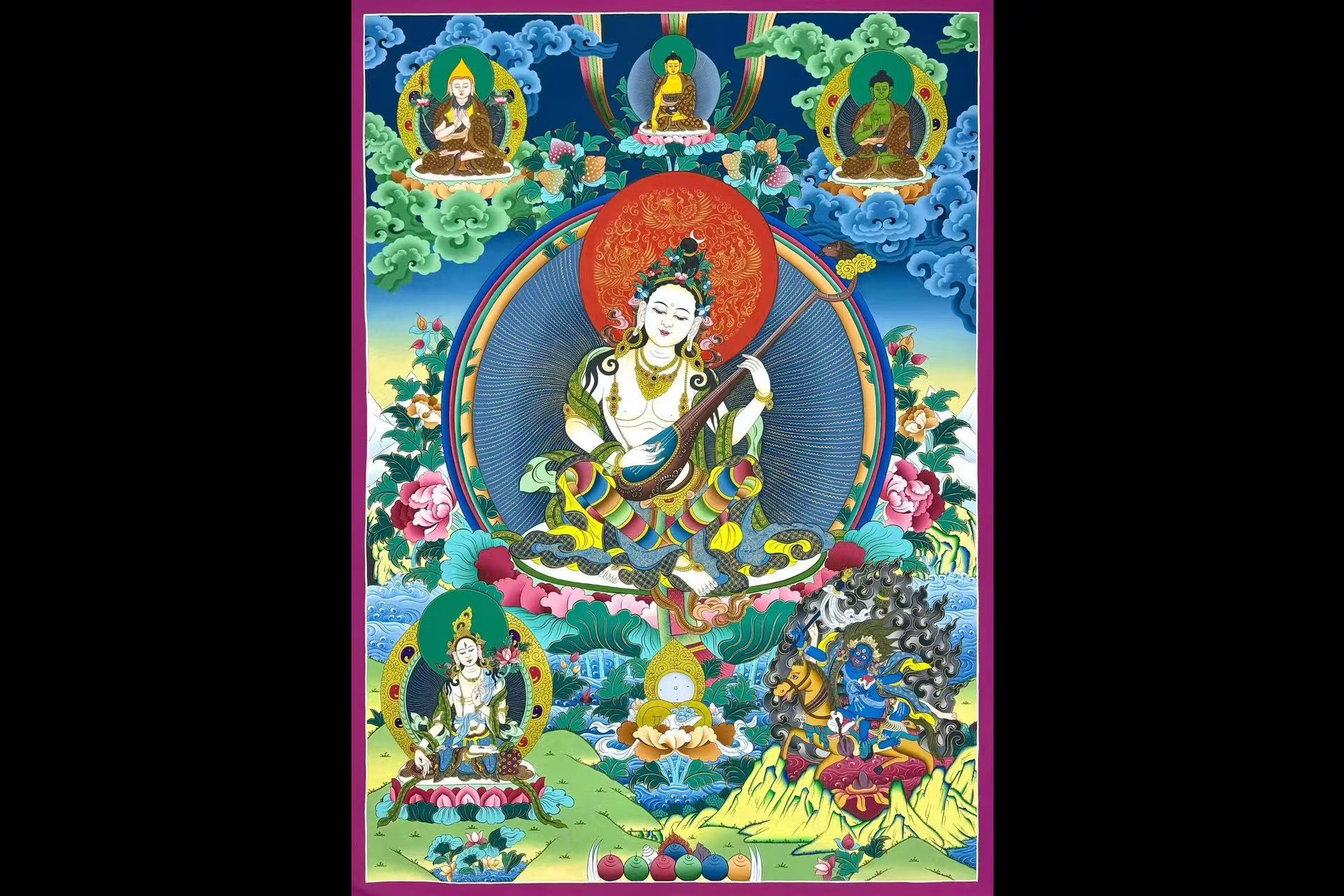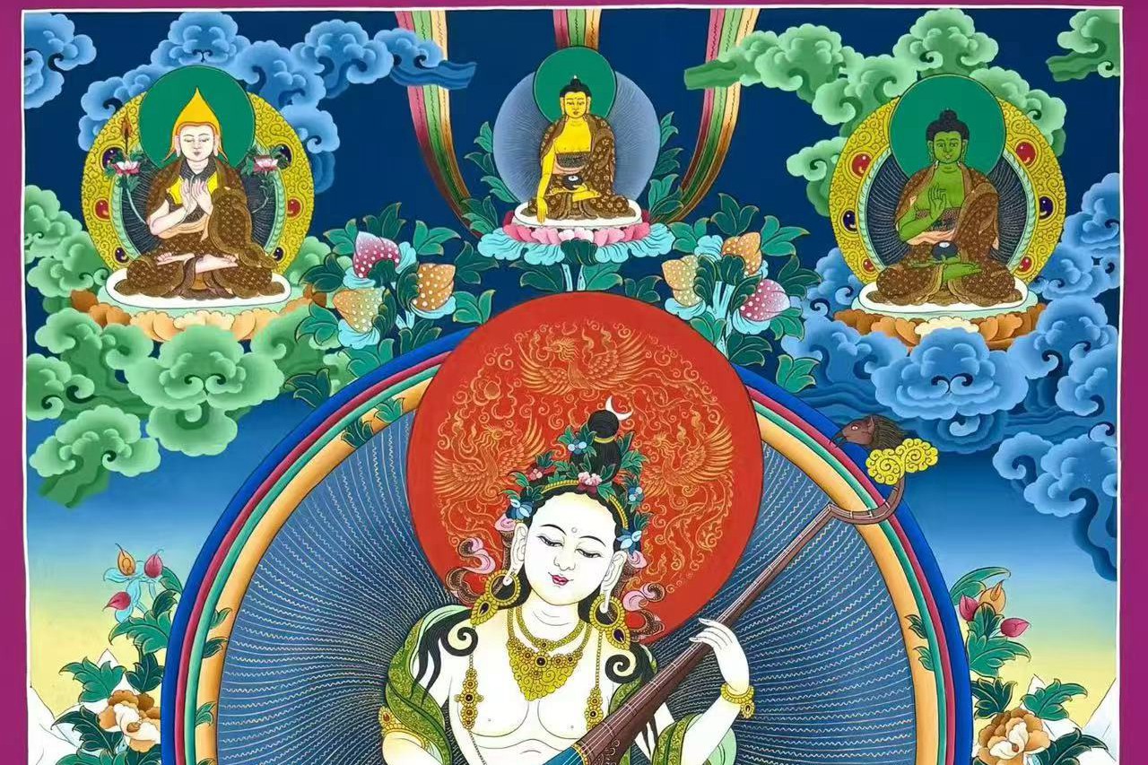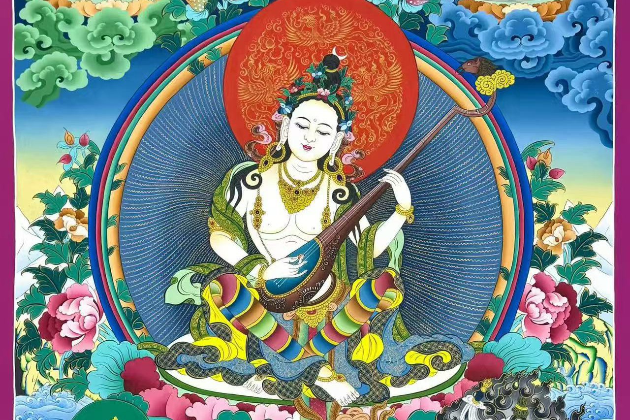 介绍:精美彩唐【妙音天女】,纯金描线,尼泊尔唐卡画师suji喇嘛诵经手绘,整幅唐卡色泽多彩炫丽温和,色彩渲染过渡流自然,画工细腻,主尊凸显,开脸庄严慈悲,天女盘坐与莲花座上,画工细腻,开脸圆润饱满庄,完美。绝对的收藏供奉佳作!妙音天女也称‘辩才天女’,是文殊菩萨的明妃(明妃代表本尊智慧的体现)。由于她是赐予各种智慧及文艺天分的本尊,凡学习或从事艺术、文学、书法、音乐、工巧、写作及辩论的人,修持此法门都会得到甚大的帮助,可迅速赐予智慧。难得精品,恭请结缘。