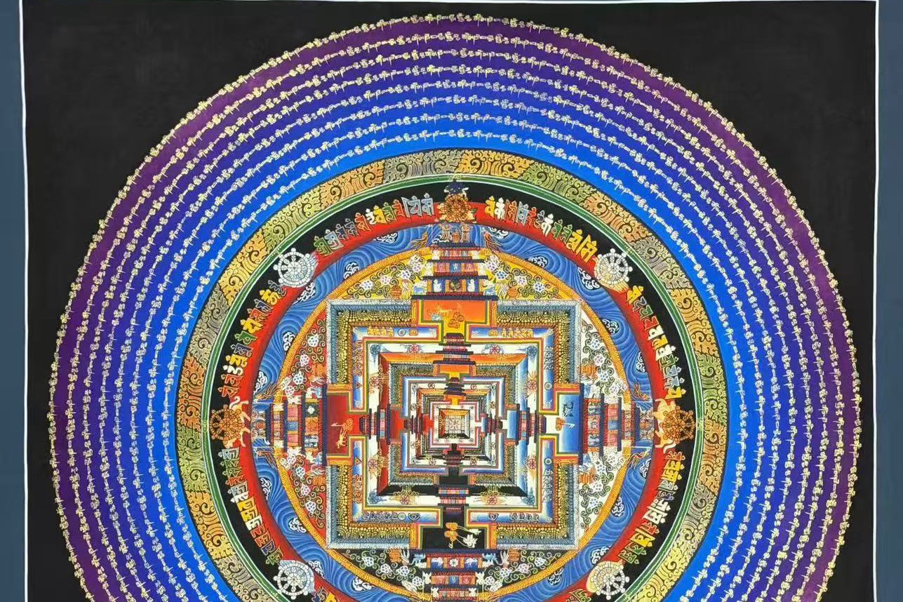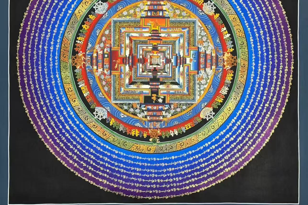 介绍:醉美深邃蓝【六字真言光晕时轮金刚坛城】,纯金描线,矿物、植物颜料晕染 坛城绘画功底登峰造极 每一处晕染过度自然而然 颜色统一 线条细密 横平竖直 内方外圆 中规中矩,难得的精品坛城,装裱后更是高端大气。