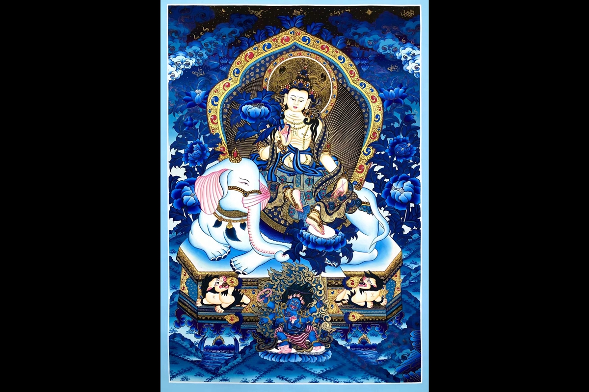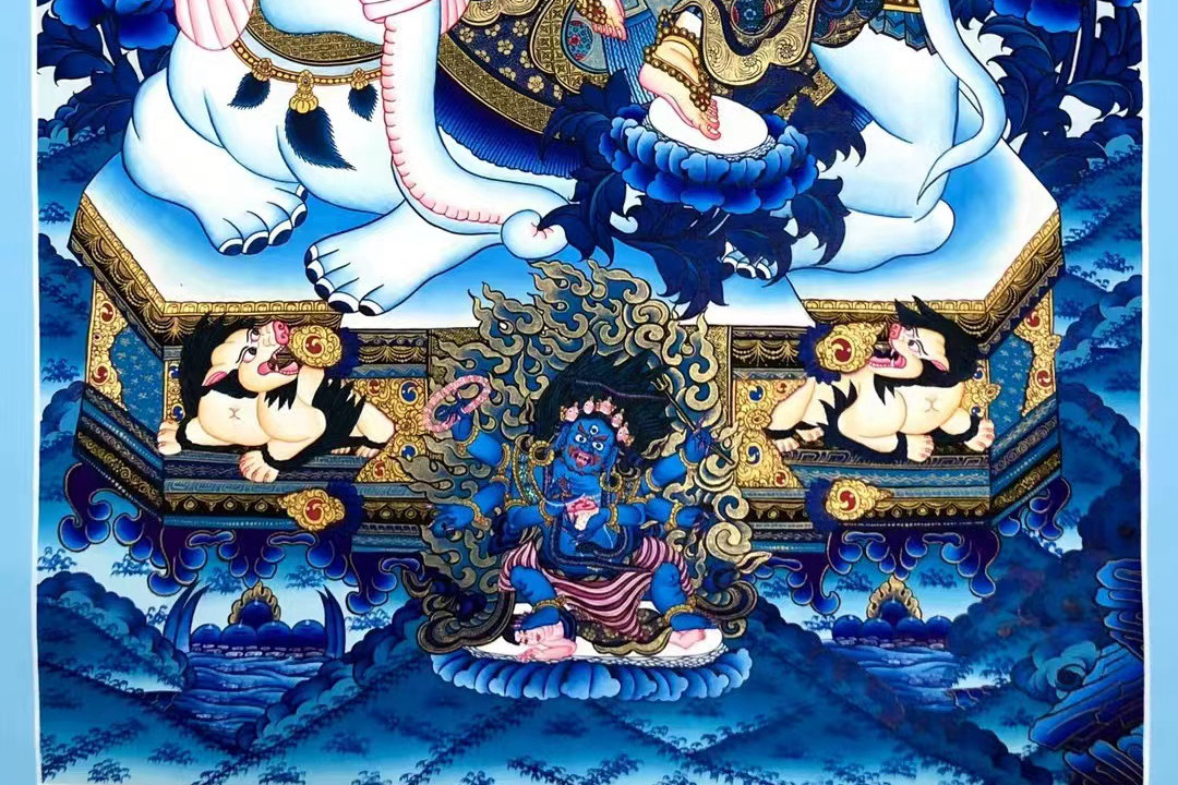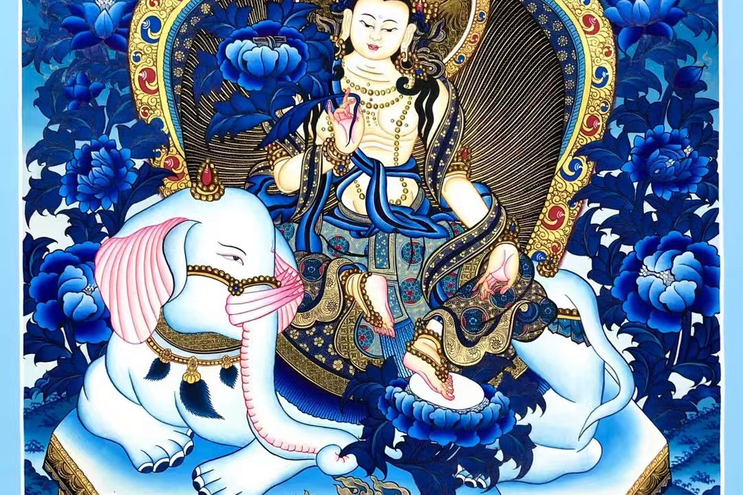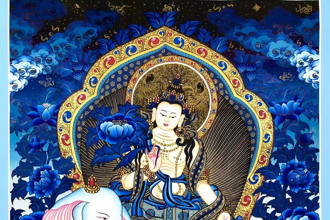 介绍:整幅唐卡以蓝色基底,上等矿物颜料 唐卡大师pravin lama笔尖修行之作 主尊宝相传神,布图丰满,颜色晕染自然和谐,画工精细到每个细节 运用独特的凸金工艺 粒粒在目 画面3d立体 24k纯金描线 实物图金光闪耀 佛光普照诚心恭请唐卡,可增加功德福寿,供奉参拜馈赠友人首选之作。普贤菩萨,世称为十大愿王,具有延命益寿之不可思议的力量。普贤菩萨是礼德和大行愿的象征,象征真理。他以智导行,以行证智,解行并进,完成求佛者的志愿,所以又称“大行普贤菩萨”。